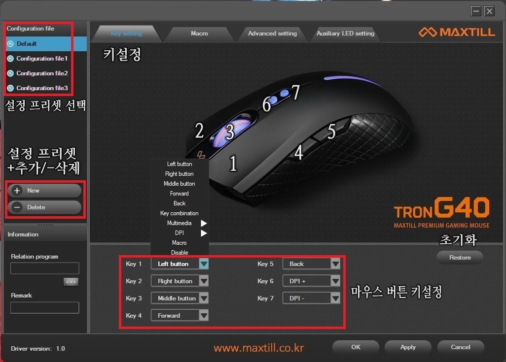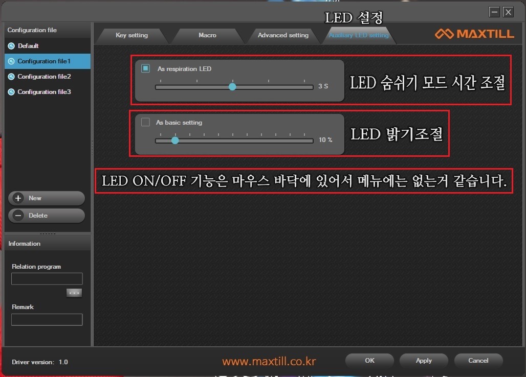 (LED색상 변경,정밀하게 설정 가능했던 X,Y축 감도 조절 그리고 버튼키 설정시 숫자로 표기되어 알기쉽게 표시가 되었지만