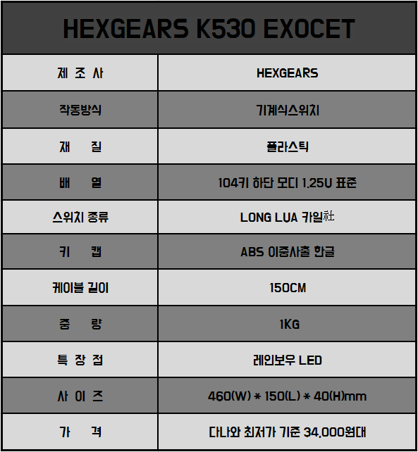 헥스기어즈 K530을 사용하며 가장 만족 스러웠던 점은 바로 가격과 스위치입니다. 3만원대에 수없이 많은 입문자용 기계식 키보드들이 있지만 대부분의 제품들이 오테뮤 스위치를 사용한 제품이지요. 하지만 K530의 경우 카일 롱화 스위치를 사용했습니다.
