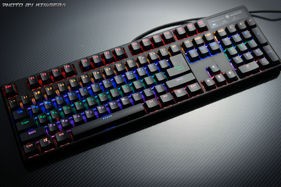 키캡은 ABS 이중사출 키캡이며, "FN" 펑션키를 이용한 핫키 기능을 가진 키캡들은 레이저 측각으로 각 키의 고유기능을 표시하고 있어 핫키 조작에 편의성을 강조했습니다.