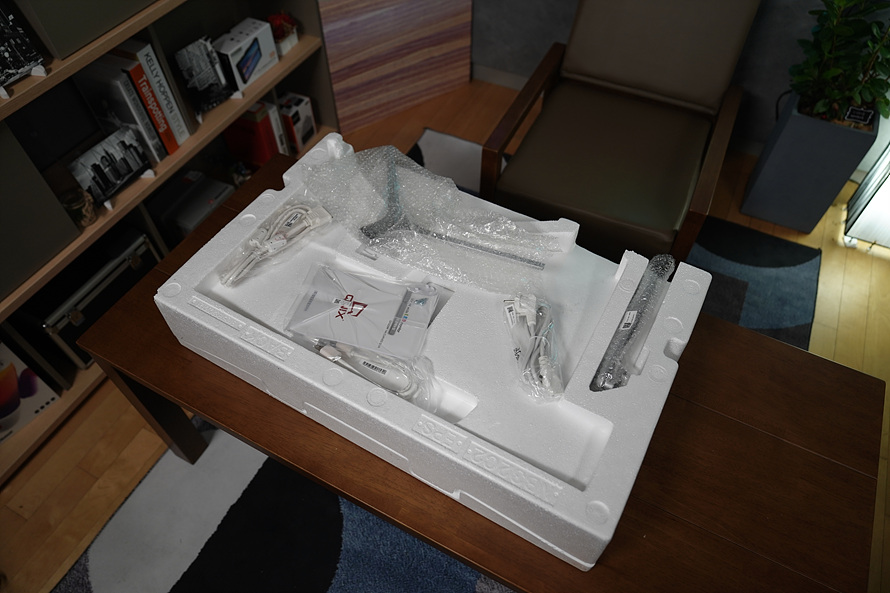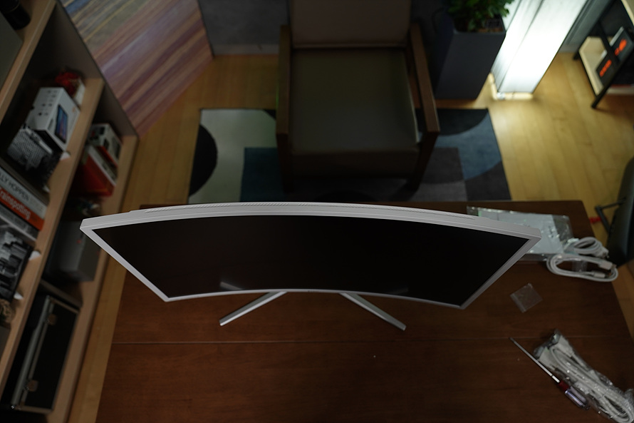 커브드 모니터는 말 그대로 패널에 곡율이 적용되어 있기 때문에, 패널을 보호하는 비밀만을 벗기고 스티로품 위에서 조립하는 것이 가장 안전합니다. 스트로폼이 아닌 평평한 책상위에 패널을 두고 힘을 가할경우 패널에 손상이 가기때문에 커브드는 꼭 이렇게 준비를 해놓고 조립을 하세요.