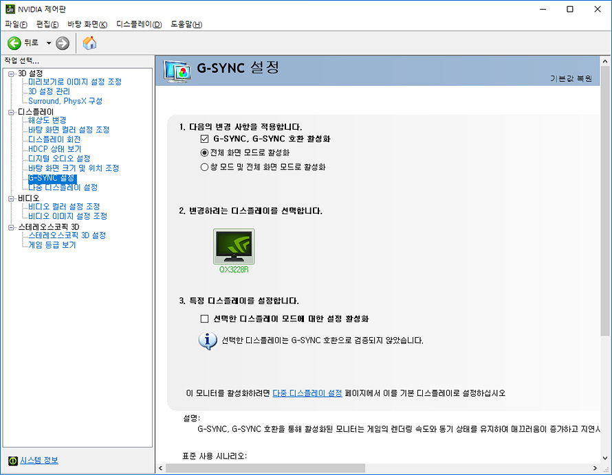 프리싱크 기능이라 적혀있지만 NVIDIA 제어판에서는 G-SYNC 기능을 활성화 할수있는 메뉴가 생겼다는걸 알수가 있습니다.