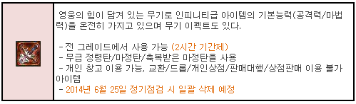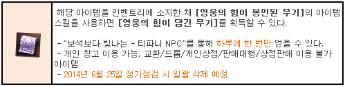 이벤트 기간 중 보석보다 빛나는 - 티파니 NPC와의 대화를 통해 영웅의 힘이 봉인된 무기를 10,000 아데나에 구입하실 수 있습니다.