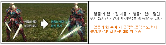 ■ 봉인된 영웅의 무기에 영웅의 힘을 부여하는 방법! 영웅의 힘이 봉인된 무기를 착용한 상태에서 영웅의 힘 스킬을 사용하면