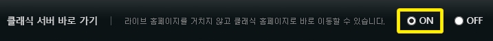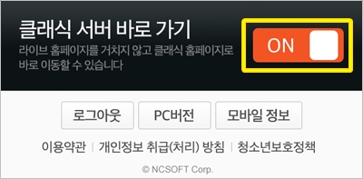 3. 이제 네이버나 다음 등의 포탈 사이트의 검색을 통하거나 주소창 입력(lineage2.plaync.com)을 통해 리니지2로 접근하여도 클래식 서버 홈으로 바로 이동시켜드립니다. - [라이브 서버 홈] 버튼을 누르면 다시 라이브 서버 홈으로 이동 가능 - 설정을 OFF로 하면 원래대로 사용 가능 이제, 웹에서도 모바일웹에서도 더 간편하게 클래식 서버 홈페이지로 이동하세요! 고맙습니다. 지젼 편리
