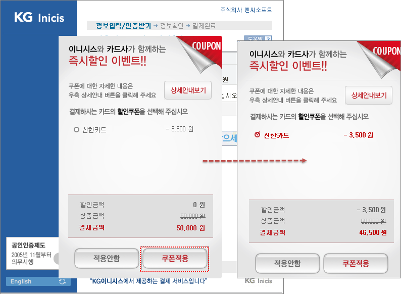 2. 신한카드 즉시할인 팝업 확인 및 쿠폰 적용 클릭