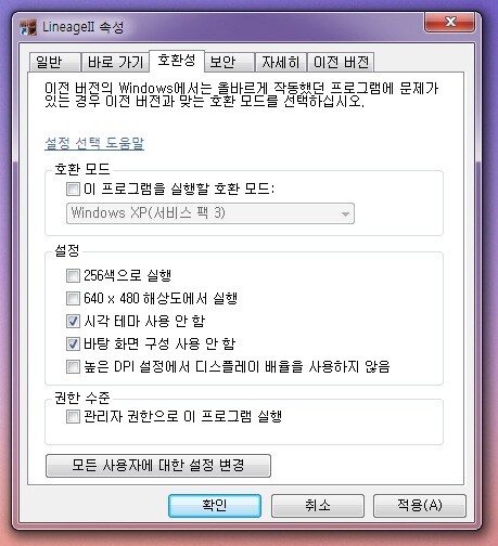 윈7 에서 리니지2 실행시 블루스크린 해결 방법 입니다.![]() URL: http://pupple.net/130067506703 윈7 사용자분들중에서 이와 비슷한 블루 스크린을 보시는분들이 계실것입니다. ( 그외 블루 스크린 오류 해결하는 방법은 위 URL 을 참고하시면 됩니다. ) 제가 이리저리 찾아서 확인해보니... Adobe AIR 충돌일 가능성이 많다고 하더군요 그럴땐 아랫 그림과 같이 설정해주시면 됩니다. ( 리니지2 실행파일 오른쪽 버튼 클릭 -> 속성 -> 호환성 ) ![]() 그래도 충돌이 나신다면... "이 프로그램을 실행할 호환 모드" 를 체크하시고 XP 서비스 팩3 로 변경 하신 후 적용 -> 확인 버튼을 지긋이 누르시면 대부분 사용이 가능하십니다.
