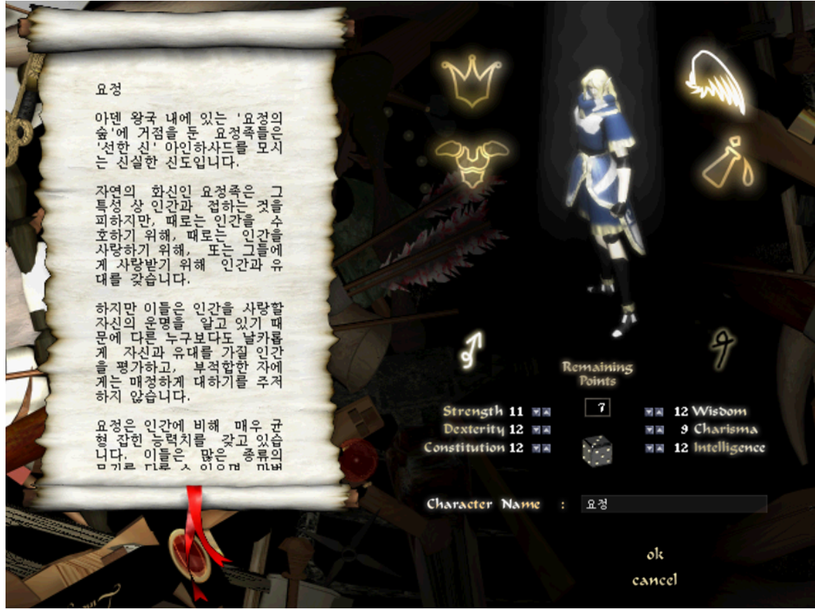 ● 정령 마법 * 일반 마법 일반 마법은 6단계까지 학습 가능하며, 8레벨마다 1단계씩 더 높은 마법을 배울 수 있다. * 정령 마법 정령 마법은 요정이 사용하는 고유 마법이다. 10레벨부터 배울 수 있으며 공통 속성 + 땅, 물, 불, 바람 속성의 총 5개 속성으로 분류할 수 있다. 어느 속성을 선택하는가에 따라 사용하는 마법이 달라지며 더 나아가 무기 및 방어구의 선택도 크게 달라진다. 요정 숲 마을에 위치한 NPC 엘뤼온를 통해 속성 계열을 선택할 수 있으며, 일부 정령 마법 아이템은 NPC 상점 ‘린다’를 통해 구입할 수 있다. 요정 마법에 대한 자세한 내용은 [요정 마법]과 [마법 사전]을 통해 확인할 수 있다. (댓글 링크 확인)