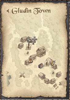 (참고) 미니맵 팝업 화면. 글루딘 마을 텔레포터 스티브 앞 위치 중 ■ 마을맵