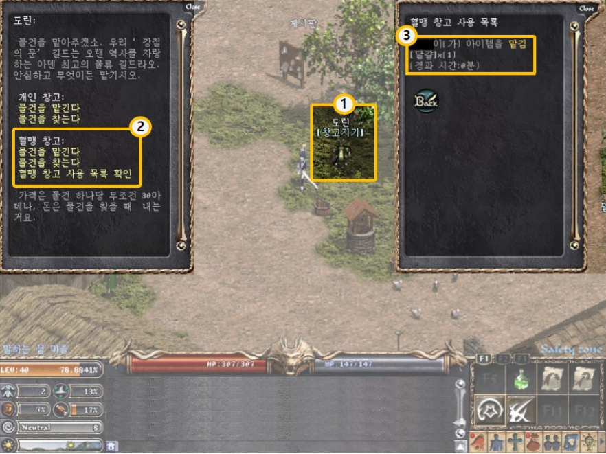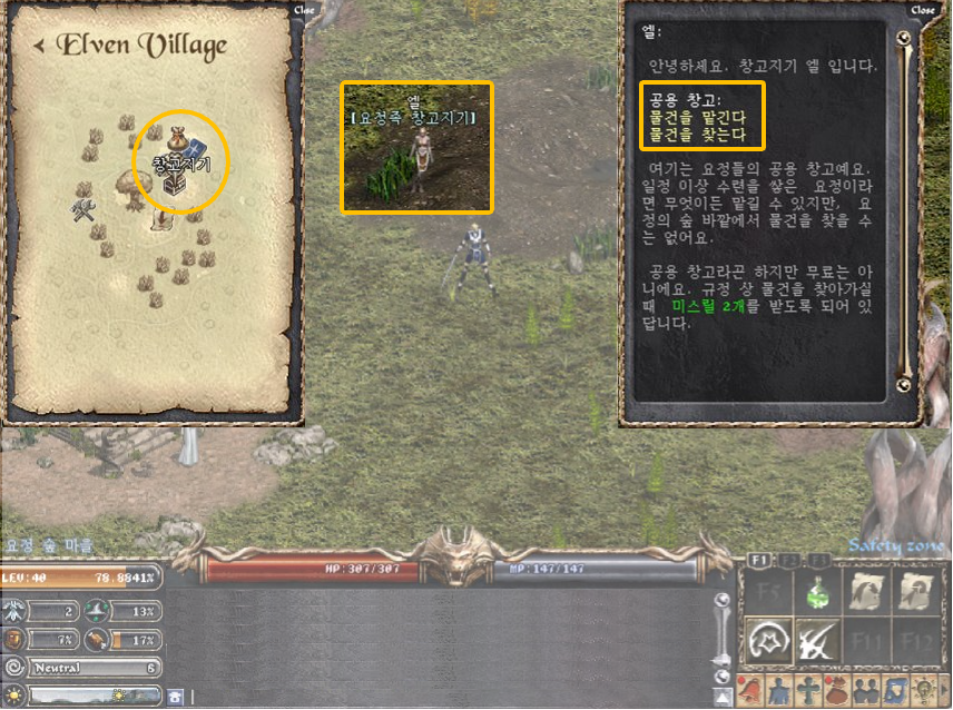 [리니지 클래식] 창고 이용 방법에 대한 안내 - 개인 창고, 혈맹 창고, 요정족 창고창고 이용 방법을 안내 드리며 창고지기, 개인 창고, 혈맹 창고, 요정족 창고에 대해 확인하세요. 게임정보는 NCER, NCER에서 알려드리는 리니지 클래식 게임소식 입니다. 이 답변은 AI가 생성한 정보입니다. 실제 게임 내용과 다를 수 있으며, 정확한 정보는 반드시 공식 채널에서 확인해주세요. 작성 기준일 : 2026.02.07 ◈ 창고지기 각 마을에 위치한 NPC 창고지기를 찾아가면 창고를 이용할 수 있다. 이들은 대부분 마을 중심부에 있으며, 마을 지도에 상자 모양의 아이콘으로 표시된다. 이들에게 말을 건 후, 개인 창고, 혈맹 창고 두 가지 메뉴를 이용하여 자신의 아이템을 관리할 수 있다. ◈ 개인 창고 동일 계정, 동일 서버 내의 캐릭터가 공유하는 창고 창고 저장이 가능한 모든 아이템을 계정 단위로 맡기고 찾을 수 있으며, 최대 100개 아이템 슬롯을 가지고 있다. 같은 계정, 같은 서버 내의 캐릭터와 내용물을 공유할 수 있어 서브 캐릭터에게 아이템을 넘겨줄 때 유용하다. 단, 퀘스트 아이템 등 일부 아이템은 창고 보관이 불가하다. 아이템을 찾을 때, 모든 마을 동일하게 30 아데나를 필요로 한다. • 아이템 보관 기준 - 아데나의 경우, 한 번에 5억 아데나씩 저장이 가능하며, 슬롯 1개에 최대 15억 아데나까지 저장 가능하다. - 무게 게이지가 100일 때, 창고에서 아이템을 찾을 수 없다. ◈ 혈맹 창고 혈맹 계급 중 일반 계급 이상의 혈원들만 이용 가능한 창고 (수련 계급 사용 불가) 혈맹 창고를 사용할 경우, 캐릭터명 + 맡고 찾은 아이템(개수) 이력이 표시되며, 이는 [혈맹 창고 사용 목록 확인] 탭에서 확인이 가능하다. 혈맹 창고는 최대 200개까지 아이템 보관이 가능하며, 아이템을 찾을 때 30 아데나를 필요로 한다. 여러 명이 공동으로 사용하는 공간이기 때문에 중요한 아이템은 맡기지 않는 것이 좋다. ◈ 요정족 창고 요정 숲 마을에는 요정 클래스만 이용 가능한 요정족 전용 창고지기 NPC 엘이 있다. 엘은 다른 마을의 개인 창고와 분리된 별도의 저장 공간이기 때문에, 보관한 아이템은 공유할 수 없다. 요정족 창고는 최대 100개까지 아이템 보관이 가능하며, 물건을 찾을 때 아데나 대신 미스릴 2개를 필요로 한다.