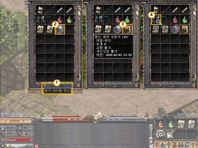 아이템 봉인계정 도용 시 피해를 최소화할 수 있는 아이템 보호 시스템 봉인된 아이템은 아이콘 우측 상단에 자물쇠 표시가 추가되는 동시에 바닥에 내려놓기, 교환, 삭제, 거래, 인챈트, 개인 상점 등록이 불가능해진다. 이 때문에 각종 불미스러운 문제를 미연에 방지할 수 있다. 봉인된 아이템의 봉인 해제는 클래식샵에서 봉인 해제 주문서 상자를 구매하여 진행이 가능하다. • 이용 방법 ① 인벤토리 창 우측 하단 자물쇠 아이콘 클릭 (마우스 오버 시 ‘아이템 봉인’ 텍스트 출력/아이콘 클릭 시 돋보기 모양으로 마우스 커서 변경) ② 봉인하고자 하는 아이템 클릭 ③ 아이템 봉인 완료 • 봉인 해제 방법 ② 부가 아이템 창고에서 봉인 해제 주문서 상자를 수령 후 오픈한다. ③ 봉인 해제 주문서 상자 오픈 시, 봉인 해제 주문서 10장을 획득할 수 있다. ④ 봉인해제 주문서를 클릭 후, 봉인 해제를 원하는 아이템을 클릭한다. ⑤ 봉인 해제 주문서 상자는 계정당 주 10회 구매 가능하며, 구매 후 부가서비스 창고에서 30분 이내 수령하지 않으면 자동 삭제된다. ⑥ 봉인 해제 주문서 또한 30분 이내 사용하지 않을 경우, 인벤토리에서 자동 삭제된다. 아이템 인챈트아이템을 단계별로 강화하는 시스템. 인챈트 시스템은 캐릭터가 착용 또는 사용할 수 있는 다양한 아이템을 주문서 또는 재료를 통해 강화하는 시스템을 말한다. 인챈트 시도 시 실패의 위험이 있으며, 실패 시 아이템이 소멸하거나 파괴될 수 있다. • 특징 - 아이템별 전용 인챈트 주문서를 통해 강화 가능하다. - 저주받은 주문서의 경우 인챈트 단계를 1 낮추게 되며, 축복받은 주문서의 경우 장비의 재질 및 인챈트 단계에 따라 1~3까지 강화된다. • 확률 확인 방법 ② 전용 인챈트 주문서 클릭 ③ 강화할 대상의 아이템 클릭 ④ 강화 확률 확인 ※ 강화 대상 아이템이 미확인 상태일 경우, 강화 확률을 확인할 수 없다. 확인 주문서를 사용해 아이템을 확인한 후 진행해야 한다. • 아이템별 사용 주문서