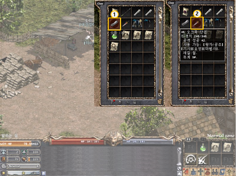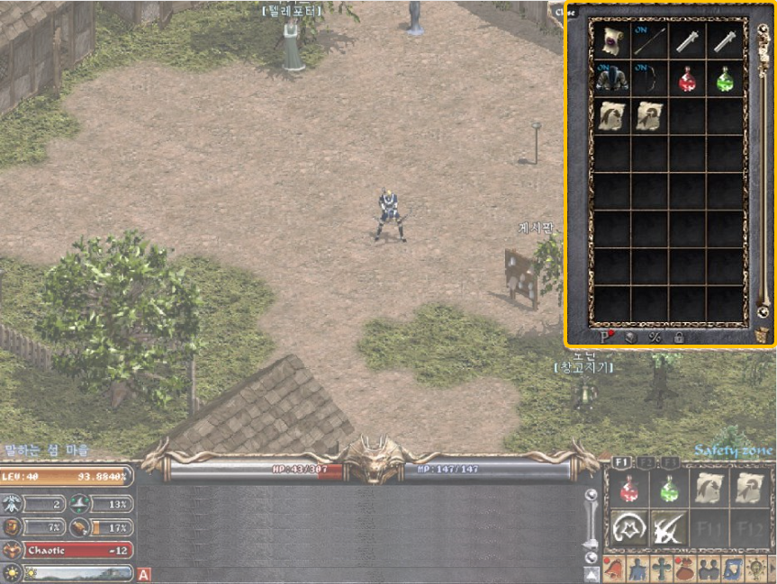 • 저주를 푸는 방법 ① 저주 풀기 주문서를 사용하여 장비에 걸려있는 저주를 해제할 수 있다. ② 장착한 장비에는 저주 풀기 주문서, 보유한 장비에는 축복받은 저주 풀기 주문서가 필요하며, 아이템 및 주문서류는 저주가 풀리지 않는다. 아이템 수리• 소개 - 손상된 아이템을 수리하는 시스템. - 돌 골렘이나 터틀 드래곤, 브롭처럼 일정 확률로 무기와 방어구를 손상시키는 몬스터들이 존재한다. 무기가 손상되면 공격 시 나오는 칼 아이콘이 붉게 표시되며 대미지가 감소한다. - 이렇게 손상된 무기와 방어구는 몇몇 마을에 있는 대장장이를 통해 수리하거나 숫돌 또는 오리하루콘으로 손상도를 회복시킬 수 있다. • 이용 방법 1. 아이템을 이용한 수리 방법 ① 숫돌 또는 오리하루콘을 더블 클릭 ② 마우스 커서가 돋보기 형태로 변경되면 손상된 아이템 수리하여 손상도 수리 ※ 재료 1개당 손상도 1 수리 2. NPC를 이용한 수리 방법 ① 마을 내 대장장이를 방문하여 대화창을 통한 수리 진행 ② 아데나를 소모하여 장비 완전 수리 ※ 손상도를 모두 수리하는 것만 가능