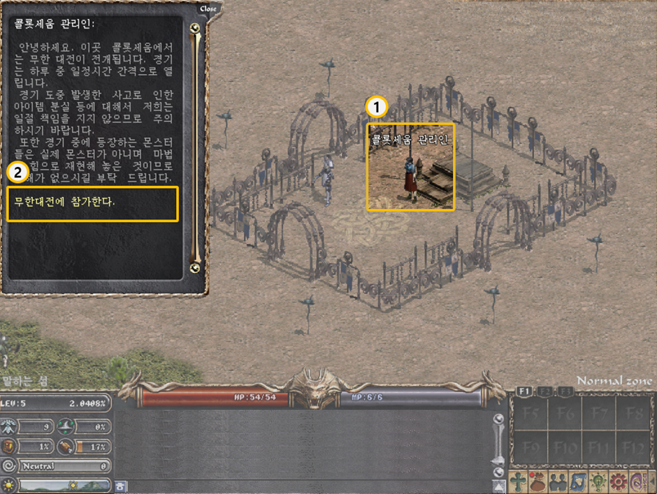 ㆍ입장 방법 ① 무한 대전이 진행되는 특정 위치의 콜롯세움 관리인 NPC 대화창을 통해 입장한다. ② 입장 시간 5분전부터 입장 가능하며, 각 플레이어의 클릭 시점에 따라 선착순 입장한다. ㆍ진행 순서 - 무한 대전 입장 후, 시작 시간까지 대기한다. - 시작 시점에 시작 예고 메시지와 함께 1라운드 몬스터가 스폰된다. - 1라운드 종료 후 완료 메시지가 출력되며, 2라운드 몬스터 투입 예고 메시지와 함께 2라운드 몬스터가 스폰된다. - 각 라운드는 약 5분간 진행되며, 스폰 종료 시 완료 메시지가 출력된다. ㆍ특징 - 경기장 내부는 Combat Zone으로 설정되며, 경기장 내에서만 랜덤 텔레포트가 가능하다. - 서먼 몬스터 마법은 사용 가능하나, 펫 사용은 불가능하다. ■ 주요 몬스터 및 리워드 무한대전에서 등장하는 주요 몬스터와 주요 드랍 아이템 정보 보스 몬스터의 경험치 보상은 살아남은 유저에게만 지급된다. [주요 몬스터 및 드랍 아이템 정보]