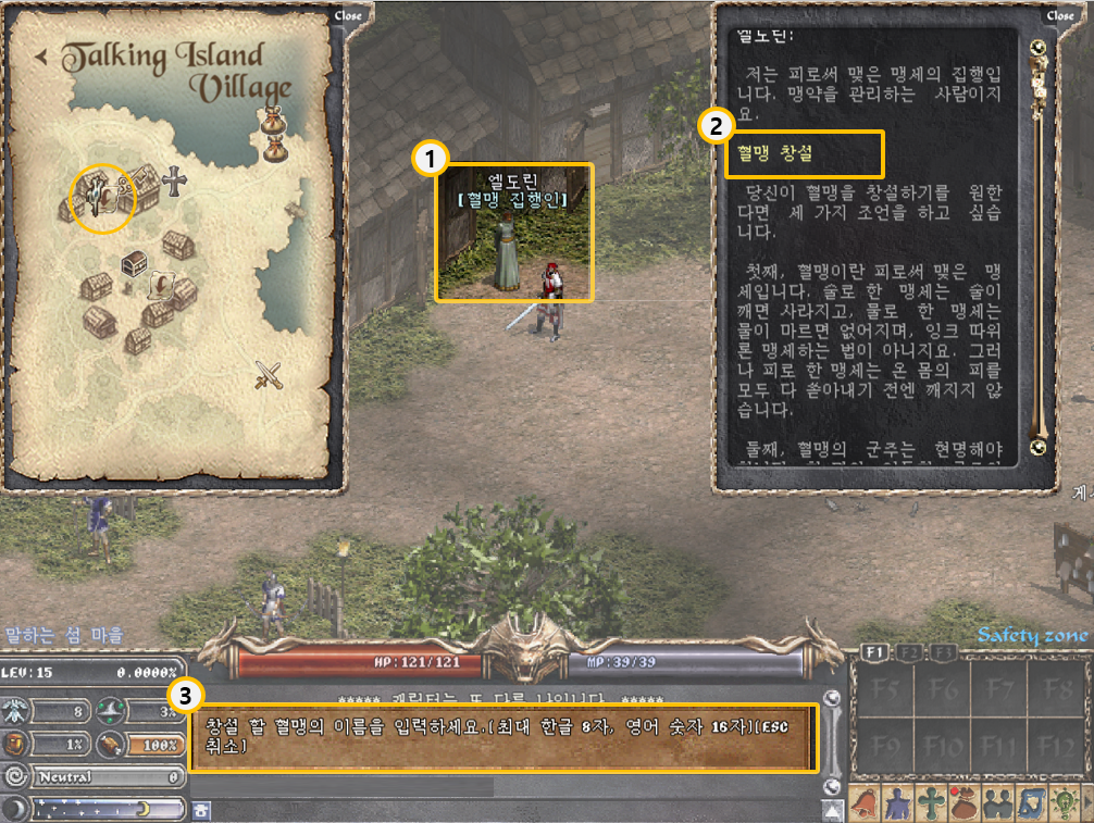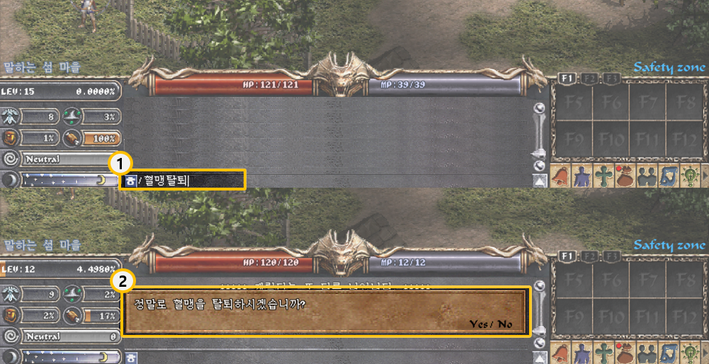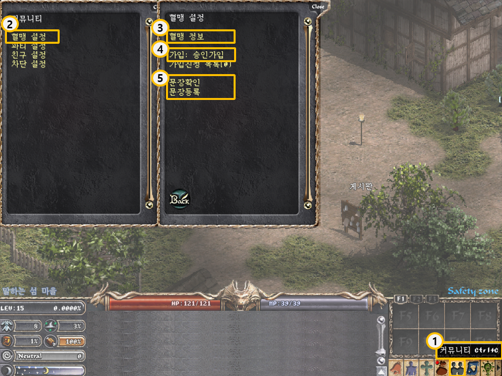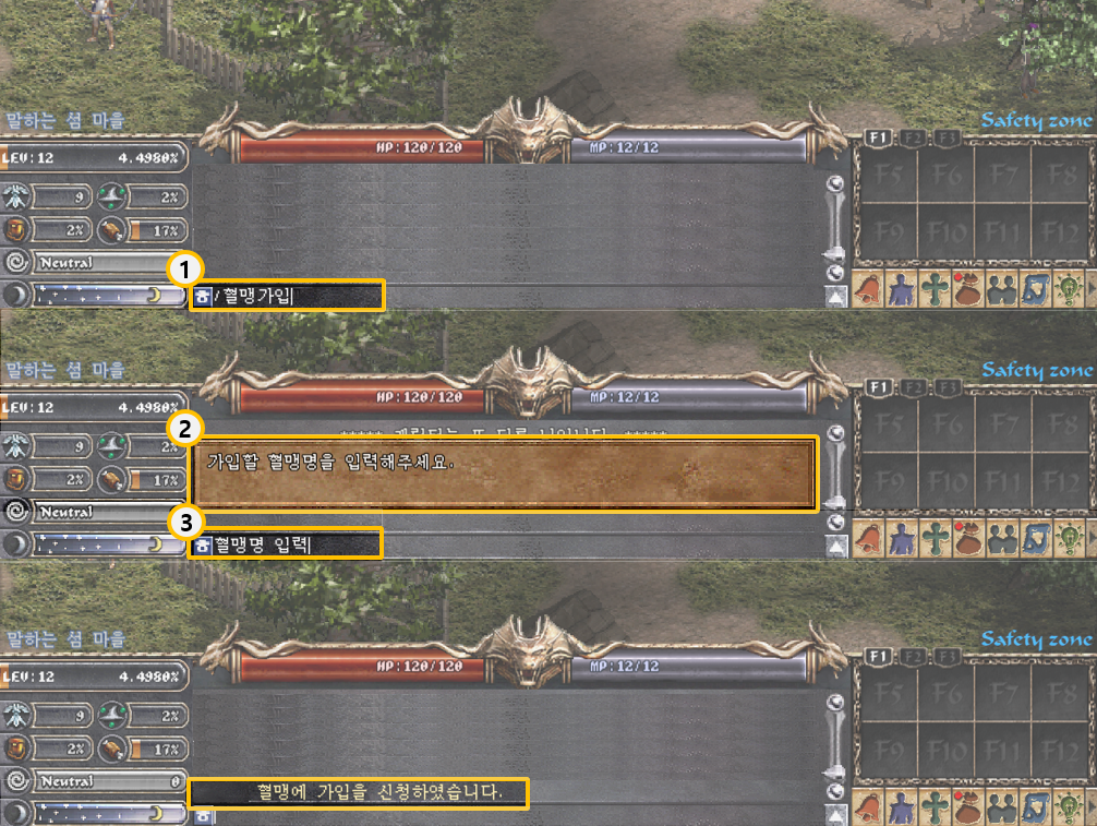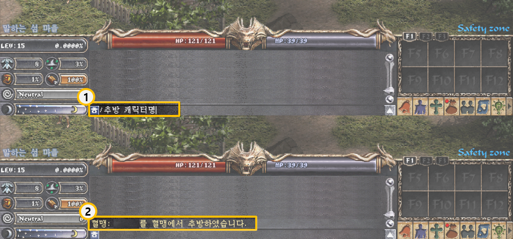 ● 혈맹 가입• 대면 가입 ① 혈맹 군주 캐릭터와 가입을 원하는 캐릭터가 마주본 상태일 경우, 가입을 원하는 캐릭터가 “/가입” 명령어 입력 ② 명령어 입력 시, 군주 캐릭터에게 혈맹 승인 여부를 묻는 팝업창 노출 ③ 군주 캐릭터가 수락 시, 혈맹 가입 완료 • 비대면 가입 ①“/혈맹가입” 명령어 입력 ② 명령어 입력 시, [가입할 혈맹명을 입력해주세요] 팝업창 노출 ③ 정확한 혈맹명 입력 시, 혈맹 설정 가입 방법에 따라 처리 * 즉시 가입 - 즉시 가입 승인 * 승인 가입 – 가입 신청 / 승인 시 가입 완료 * 암호 가입 – 암호 입력창 노출 / 암호 정상 기입 시, 즉시 가입 • 가입 제한 - 공성 진행 중 혈맹원 가입 불가 - 군주 클래스도 혈맹원으로 가입 가능 ● 혈맹 탈퇴 / 추방 / 해산• 혈맹 탈퇴 ① 혈맹원은 채팅창에 명령어 “/혈맹탈퇴” 입력하여 탈퇴 가능 단, 공성 진행 중에는 탈퇴 불가 • 혈맹 추방 ① 명령어 “/추방” 또는 “/추방 [캐릭터명]”로 추방 가능 * 혈맹 추방은 군주 및 부군주 계급만 진행 가능 * 추방은 공성 진행 중에도 가능 • 혈맹 해산 ① 명령어 “/혈맹탈퇴”로 해산 가능 혈맹 해산은 군주만 진행 가능 해산 시 모든 혈맹의 정보가 삭제 * 혈맹 창고에 아이템이 있는 경우 혈맹 해산 불가능 * 공성 진행 중 선포하지 않은 혈맹은 해산 가능 * 공성 진행 중 선포한 혈맹은 해산 불가능 * 성, 아지트를 소유하고 있는 혈맹은 해산 불가능 ● 혈맹 계급과 권한혈맹 군주는 혈맹원에게 계급을 임명할 수 있으며, 군주, 부군주, 수호기사, 정예, 일반, 수련 총 6개로 구분된 계급에 따라 권한이 다르게 설정된다. 혈맹 군주가 부군주 1명, 수호기사 3명, 정예 7명까지 설정 가능하다. 일반 계급은 인원 제한이 없으며, 수련 계급은 혈맹 가입 시 자동 부여된다.