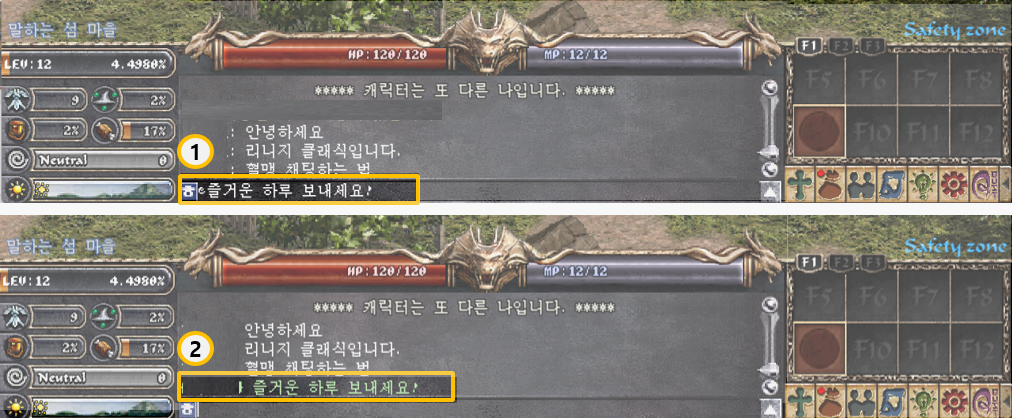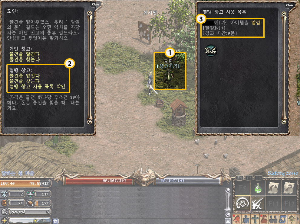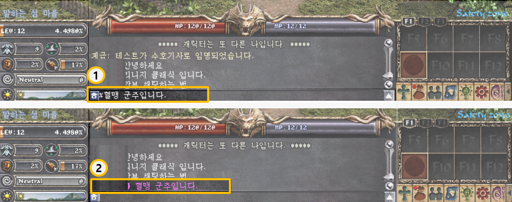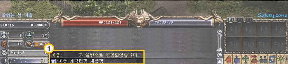 ① 임명 방법: 명령어 “/계급 캐릭터명 계급명을 입력하여 임명 ● 기타 기능• 혈맹 채팅 - 소속된 혈맹 내 모든 혈맹원들이 이용 가능한 채팅 채널 (단축키: @) • 간부 채팅 - 소속된 혈맹 내 혈맹원 중 정예 등급 이상에게만 노출 (단축키: %) • 혈맹 창고 - 일반 계급 이상 사용 가능한 혈맹 창고 (수련 계급 사용 불가) - 혈맹 창고 아이템 최대 보관 가능 수는 200개로, 혈맹 창고를 사용할 경우 캐릭터명 + 맡고 찾은 아이템(개수) 이력 표시 • 호칭 - 혈맹에 가입한 유저는 스스로 호칭 부여가 불가 - 군주 레벨 10 이상일 경우에만 호칭 부여 가능하며, 10레벨 이상의 혈맹원에게만 호칭 부여 가능 - 혈맹 가입 이전에 등록된 호칭은 혈맹 가입 시 초기화되며, 혈맹 가입 상태에서의 호칭은 혈맹 탈퇴 시 초기화 ① 호칭 부여 방법: 명령어 “/호칭 캐릭터명 호칭명 입력
