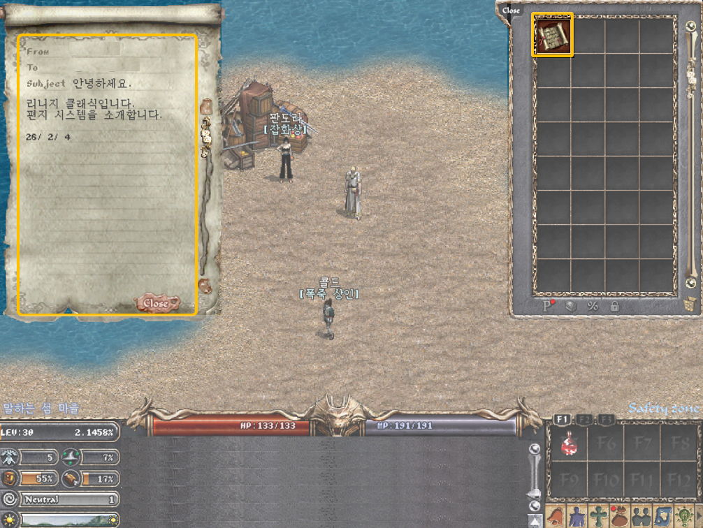 [리니지 클래식] 원하는 캐릭터 또는 혈맹원에게 편지를 보내 보세요! 편지 쓰기, 편지 읽기, 편지 관리, 편지 시스템 소개해 드립니다.리니지 클래식 플레이 시 원하는 캐릭터 또는 혈맹원에게 편지를 보낼 수 있으며 편지 쓰기, 편지 읽기, 편지 관리할 수 있는 편지 시스템 소개해 드립니다. 게임정보는 NCER, NCER에서 알려드리는 리니지 클래식 게임소식 입니다. 이 답변은 AI가 생성한 정보입니다. 실제 게임 내용과 다를 수 있으며, 정확한 정보는 반드시 공식 채널에서 확인해주세요. 작성 기준일 : 2026.02.07 ● 편지 시스템원하는 캐릭터 또는 혈맹원에게 텍스트로 구성된 편지 발송 가능 편지는 잡화상 NPC를 통해 편지지, 혈맹 편지지를 구매하여 이용 가능하며, 편지는 자기 자신에게는 보낼 수 없다. ● 편지 쓰기① 잡화상을 통해 구매한 편지지, 혈맹 편지지 아이템을 인벤토리에서 더블 클릭 시, 편지 쓰기 모드로 들어간다. ② 수신자, 제목, 내용을 입력한 후 [Send] 버튼을 누르면 편지가 발송된다. ③ 편지를 보낼 때 발송 날짜가 자동으로 찍히며, 내용에는 특수문자(한자키) 입력도 가능하다. ④ 혈맹 편지의 경우, 수신자에 혈맹명을 입력하면, 해당 혈맹의 모든 혈맹원에게 편지가 한꺼번에 보내지게 된다. • 제목 제한 - 제목에는 특수문자 입력 불가 - 제목 글자수 제한은 한글 20자, 영문 40자 제한이며 글자 수가 넘어갈 경우 작성되지 않는다. ● 편지 읽기① 새로운 편지 도착 시, 캐릭터 근처로 비둘기가 날아오게 된다. ② 로그아웃 상태에서 편지를 수신할 경우, 로그인 시 인벤토리에서 편지를 확인할 수 있다. ● 편지 관리작성하지 않은 ‘빈 편지지’의 경우, 창고 보관, 교환 및 삭제가 가능하다. 수신한 편지지는 창고 보관, 교환 및 삭제가 가능하다. 인벤토리가 가득 찰 경우, 편지를 보관할 수 없으므로 보관이 필요한 편지는 창고 보관하는 것을 추천한다.