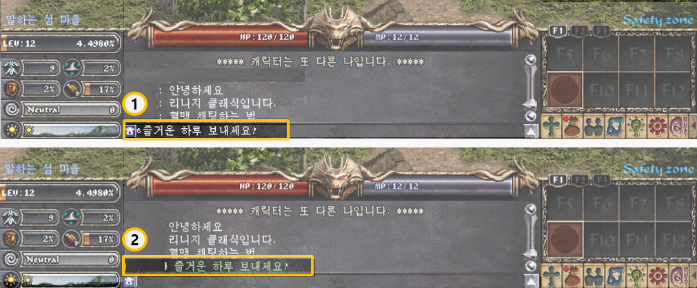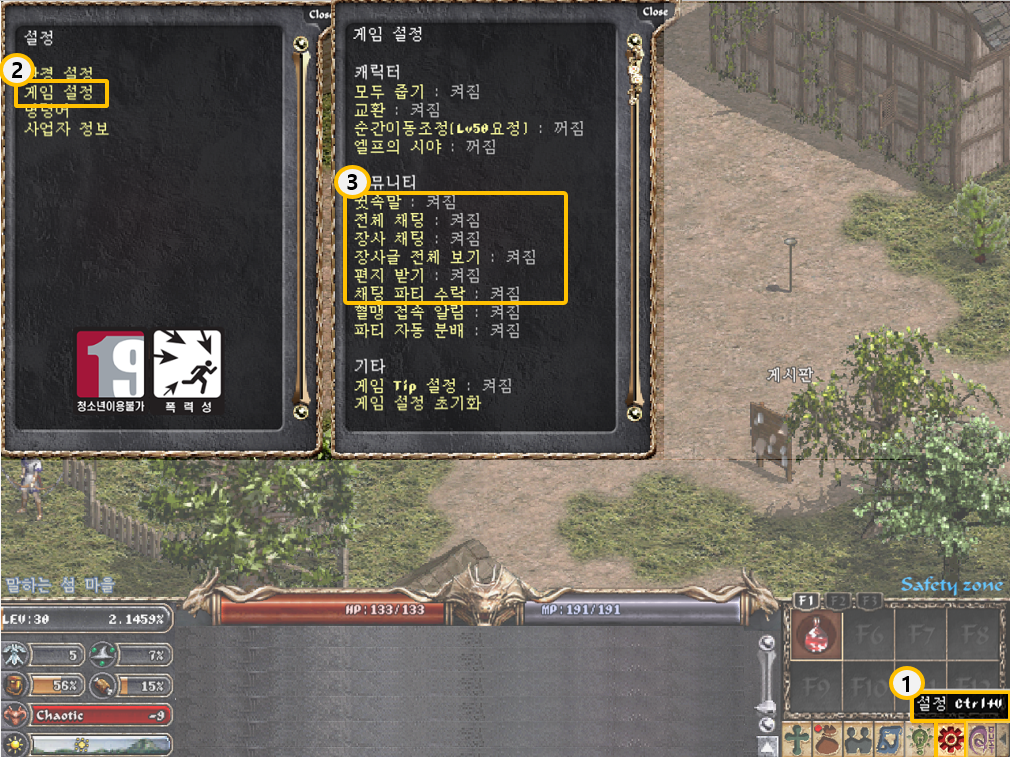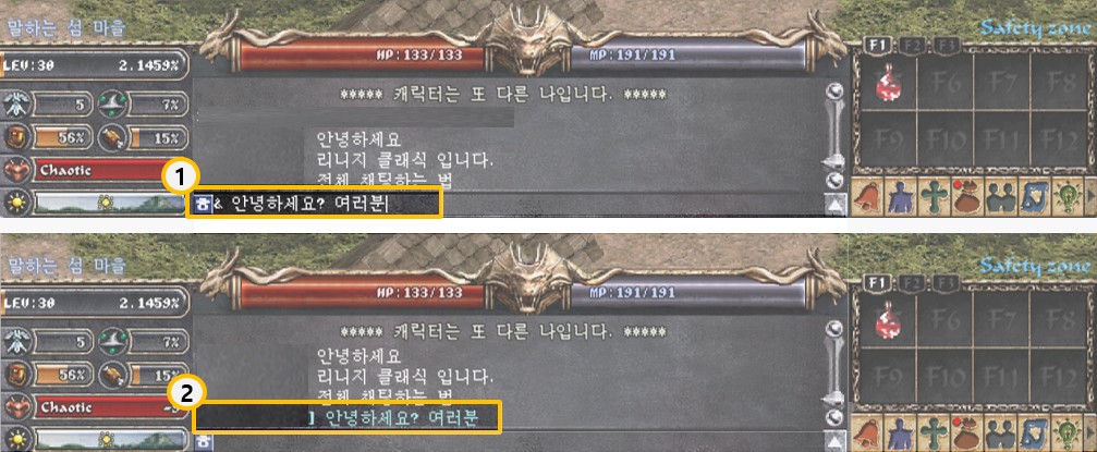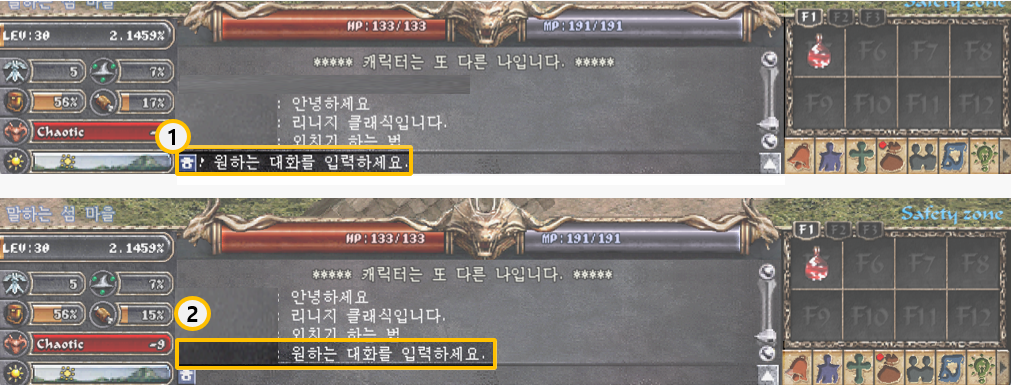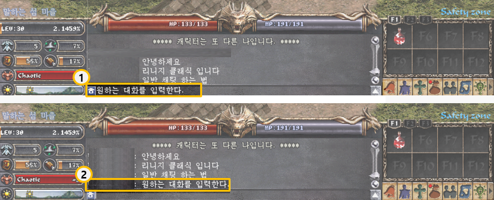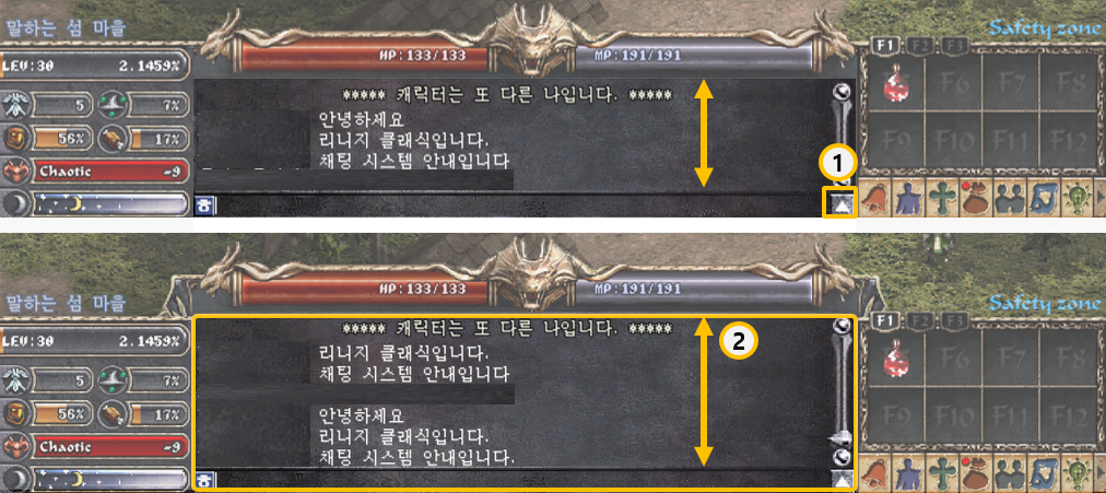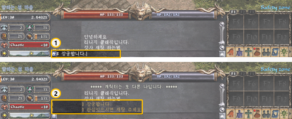 [리니지 클래식] 채팅 편의 기능, 채팅 색상 변경, 외치기, 귓속말, 파티 채팅, 혈맹 채팅, 채팅 금지 등 기능을 활용하여 채팅을 이용해 보세요.리니지 클래식의 채팅 편의 기능(채팅 설정, 채팅창 확대/축소, 채팅 색상 변경), 일반 채팅, 외치기, 전체 채팅, 귓속말, 장사 채팅, 파티 채팅, 혈맹 채팅, 간부 채팅, 채팅 파티, 채팅 금지에 대해 소개해 드립니다. 게임정보는 NCER, NCER에서 알려드리는 리니지 클래식 게임소식 입니다. 이 답변은 AI가 생성한 정보입니다. 실제 게임 내용과 다를 수 있으며, 정확한 정보는 반드시 공식 채널에서 확인해주세요. 작성 기준일 : 2026.02.07 ● 채팅 시스템수많은 플레이어와 만나게 되는 리니지의 세계에서 그들과 대화를 나누는 수단인 채팅은 매우 중요하다. 이러한 채팅은 몇 가지 간단한 명령어를 이용하여 메시지의 색을 바꾸거나 특수 문자 등의 강조 효과를 줄 수 있다. ● 채팅 편의 기능설정창 (Ctrl+V) – 게임 설정을 통해, 원하는 채팅만 확인 가능하도록 설정이 가능하다. • 채팅창 확대/축소 - 채팅창 우측 화살표를 클릭하여 채팅창의 크기를 늘리거나 줄일 수 있다. • 채팅 색상 변경 - 팔레트 UI (Ctrl+O) – 색상 클릭하여 채팅창 글씨를 변경할 수 있다. ● 일반 채팅누구나 이용할 수 있는 기본적인 채팅 아무런 조작 없이 채팅창에 원하는 말을 입력하면 된다. 캐릭터 머리 위에 말풍선이 띄워지며, 채팅 내용은 플레이 화면에만 흰색 글자로 노출된다. ● 외치기화면 밖 유저들에게도 노출되는 일반 채팅 캐릭터 머리 위에 말풍선이 띄워지며, 외치기를 실행할 때마다 배고픔 게이지가 감소된다. 외치기는 일반 채팅과 동일하게 글자는 흰색으로 노출된다. (입력 방식: "!" + 원하는 대화 입력) ● 전체 채팅같은 서버에 있는 모든 유저에게 노출되는 전체 채팅 전체 채팅은 30레벨 이상부터 이용할 수 있으며, 메시지는 하늘색으로 노출된다. (입력 방식: "&" + 원하는 대화 입력) ● 귓속말