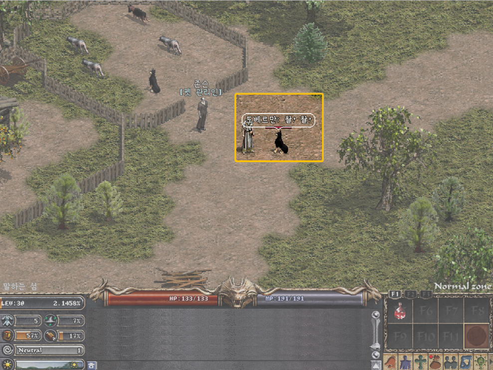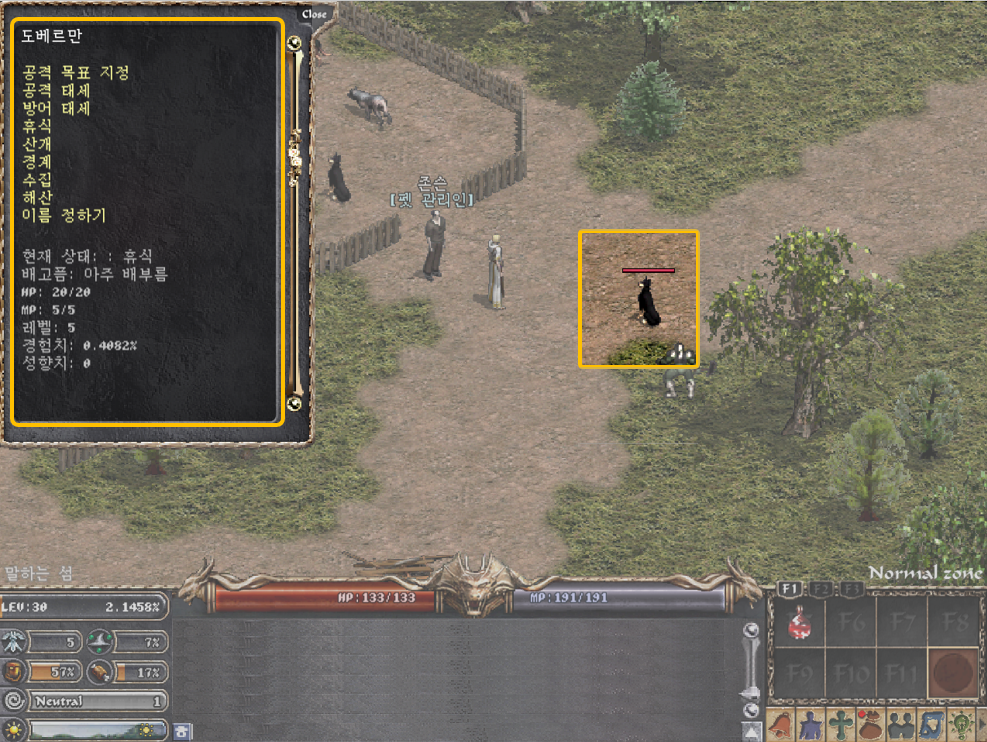 ★ 특징 ★ • 획득 방법 - 길들이기 ① 필드에 돌아다니는 길들이기 가능한 몬스터를 찾아 공격한다. ② 이때, 검 또는 활 등 무기를 착용하여 공격 시 피가 적은 몬스터는 금방 죽는다. ③ 무기를 해제하고 주먹으로 몬스터를 공격한다. ④ 몬스터의 일정량의 HP를 남겨두고 길들이기 먹이(고기, 괴물눈 고기, 달걀)를 준다. ⑤ 길들이기 성공 시, 펫 목걸이를 획득하며, 펫 길들이기는 최대 10회 가능하다. ⑥ 길들여진 펫은 모든 마을에 위치한 펫 보관소에 맡길 수 있다. 혹은 리스타트 시 자동으로 펫 보관소에 맡겨 진다. ⑦ 향후, 맡겨진 펫은 펫 보관소에서 일정 금액 지불 시 다시 찾을 수 있다. • 길들이기에 영향을 주는 사항 ① 캐릭터 스탯: CHA 스탯이 높을수록 성공 확률이 증가한다. ② 몬스터 체력: 체력이 낮을수록 성공 확률이 증가한다. ㆍ먹이 주기와 포만감 ① 펫에게는 포만감 수치가 존재한다. 펫 배고픔 상태가 지속되어 포만감이 10%가 될 경우, 길들이기가 해제될 수 있어 먹이를 주어야 한다. ② 먹이는 인벤토리에서 아이템을 드래그하여 펫에게 주면 된다. ③ 펫을 길들인 직후에는 포만감 수치가 100% ‘아주 배부름’ 상태가 된다. ④ 길들이기가 해제될 경우 필드 NPC로 전환되며 지니던 아이템은 유저에게 준다. ㆍ펫 호루라기 ① 펫 호루라기를 사용하여 멀리 있는 펫을 부르거나 태세 전환용으로 사용할 수 있다. ② 각 마을 상점에서 500아데나를 지불하여 구입 가능하다. ㆍ펫 명령 펫은 주인의 명령에 따라 행동을 하기 때문에 명령을 내려주어야 한다. 소환한 펫을 좌클릭하여 생성되는 UI에서 명령을 내릴 수 있다. 펫의 레벨이 주인보다 높을 경우, 명령을 따르지 않는다. ① 공격 목표 지정: 주인이 지정한 특정 NPC 혹은 캐릭터를 공격한다. ② 공격 태세: 주인을 따라다니며 주인이 공격하는 대상 혹은 주인을 공격하는 대상을 공격한다. ③ 방어 태세: 주인을 따라 이동만 함. 자신을 공격하는 대상에 한하여 공격한다. ④ 휴식: 명령을 받은 자리에서 움직이지 않는다. 단, 자신을 공격하는 대상에게는 반격한다. ⑤ 산개: 자신의 주인을 중심으로 떨어져 이동 후 휴식 태세로 변경된다. ⑥ 경계: 명령을 받은 자리에서 대기하고 있음. 자신 혹은 주인을 공격하는 몬스터를 공격하고, 해당 몬스터를 처지하면 다시 자리로 돌아간다. ⑦ 수집: 주인의 근처에 있는 아이템들을 모두 주워 주인의 인벤토리로 전달한다. 레벨이 올라갈수록 더 멀리 있는 아이템들까지 수집이 가능하다. ⑧ 해산: 길들인 상태를 해제하는 명령으로, 해산 후에는 다시 길들일 수 없다. 길들인 상태가 해제되면 보유하고 있던 아이템은 유저 인벤토리로 이동된다. ★ 펫 보관소 ★ 말하는 섬 마을-존슨, 우드백 마을-마빈, 켄트성 마을-딕 NPC를 통해 펫을 맡기고 찾을 수 있다. 맡길 때는 비용이 발생하지 않지만, 찾을 때는 50아데나를 지불해야 한다. ㆍ기능 ① 보관소에 맡겨진 펫은 HP/MP 회복되지 않는다. ② 보관소에 맡겨진 펫은 포만감 수치가 줄지 않는다. ③ 보관소에 맡겨진 펫은 상태이상(스턴, 독 등)에 걸려있을 경우 해제된다. ④ 보관소에 펫을 맡길 경우, 펫이 소지하고 있던 아이템은 모두 유저 인벤토리로 이동되며, 유저가 더 이상 아이템을 받을 수 없을 경우 나머지 아이템은 바닥에 드랍된다. ⑤ 찾을 때 아데나가 부족하면 펫 찾기가 불가능하다. ⑥ 펫을 찾은 직후에 펫은 휴식태세가 기본이다. ⑦ 펫을 여러 마리 동시에 맡기고 찾기가 가능하다. ⑧ 캐릭터의 접속이 끊기면, 펫은 펫 보관소로 이동되며 펫이 지니고 있던 아이템은 삭제된다.