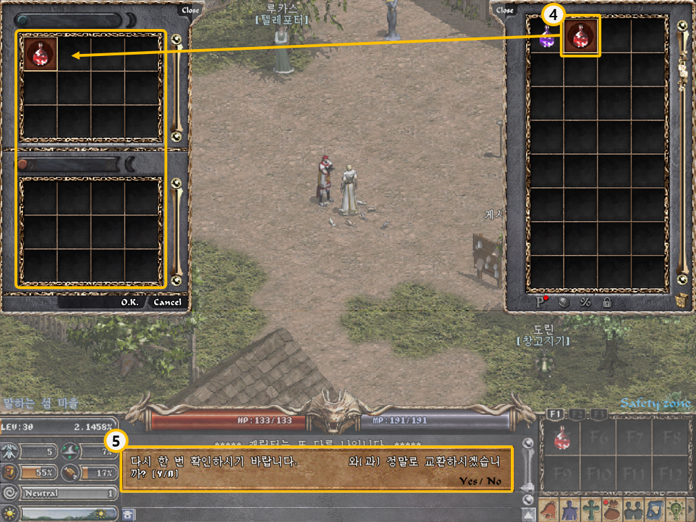 [리니지 클래식] 유저간 아이템 교환이 가능합니다! ☆교환 시스템☆교환은 두 명의 캐릭터가 서로 아이템을 교환할 수 있는 시스템입니다. 게임정보는 NCER, NCER에서 알려드리는 리니지 클래식 게임소식 입니다. 이 답변은 AI가 생성한 정보입니다. 실제 게임 내용과 다를 수 있으며, 정확한 정보는 반드시 공식 채널에서 확인해주세요. 작성 기준일 : 2026.02.07 교환 시스템 두 명의 캐릭터가 서로 아이템을 교환할 수 있는 시스템이다. • 아이템 교환 방법 1. 아이템 교환을 하고자 하는 캐릭터와 마주본다. 2. 채팅창에 “/교환”을 입력하거나 행동창(Ctrl+D)-교환을 통해 아이템 교환 신청을 한다. 3. 상대 캐릭터가 교환 신청 수락 시, 화면 내 아이템 교환창이 팝업된다. 4. 교환하고자 하는 아이템을 드래그하여 교환창에 등록 후 OK 버튼을 클릭한다. 5. 채팅창에 팝업된 메시창의 “Yes” 버튼을 클릭하면 아이템 교환이 완료된다. • 특징 1. 한 번에 등록 가능한 아이템 종류는 12개이다. 2. 교환하려는 아이템으로 인해 무게 게이지가 100%이상 되면 아이템 교환이 실패한다.