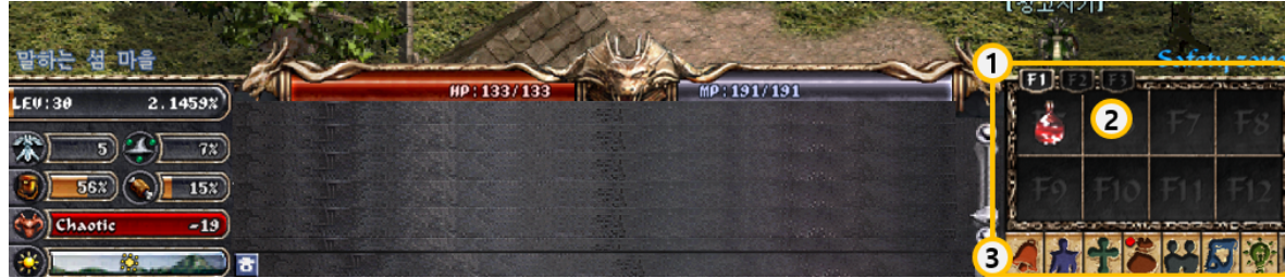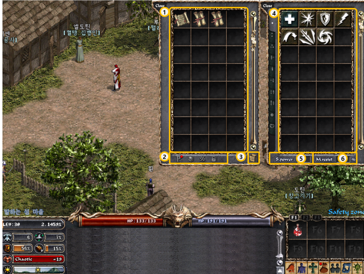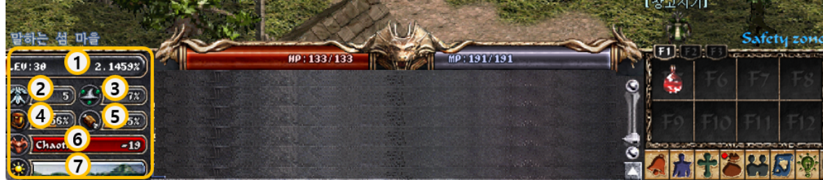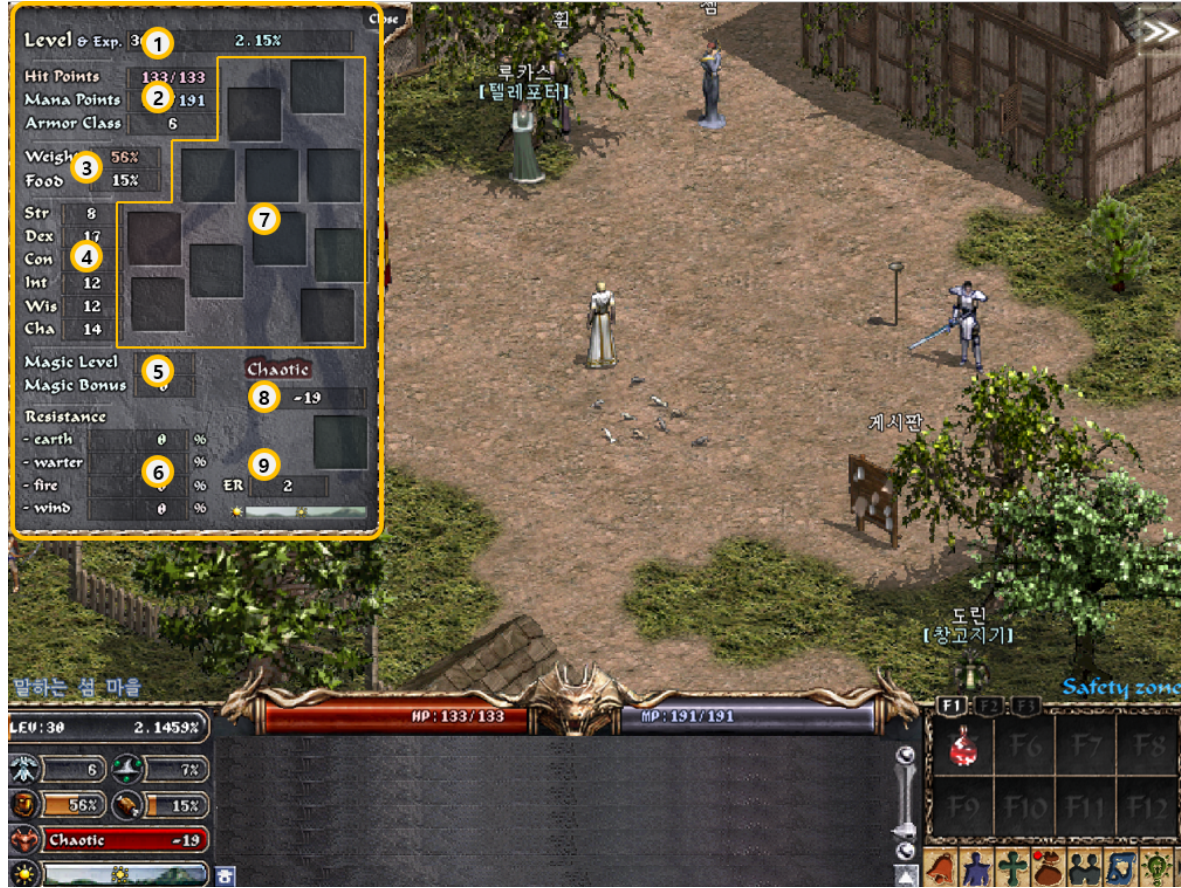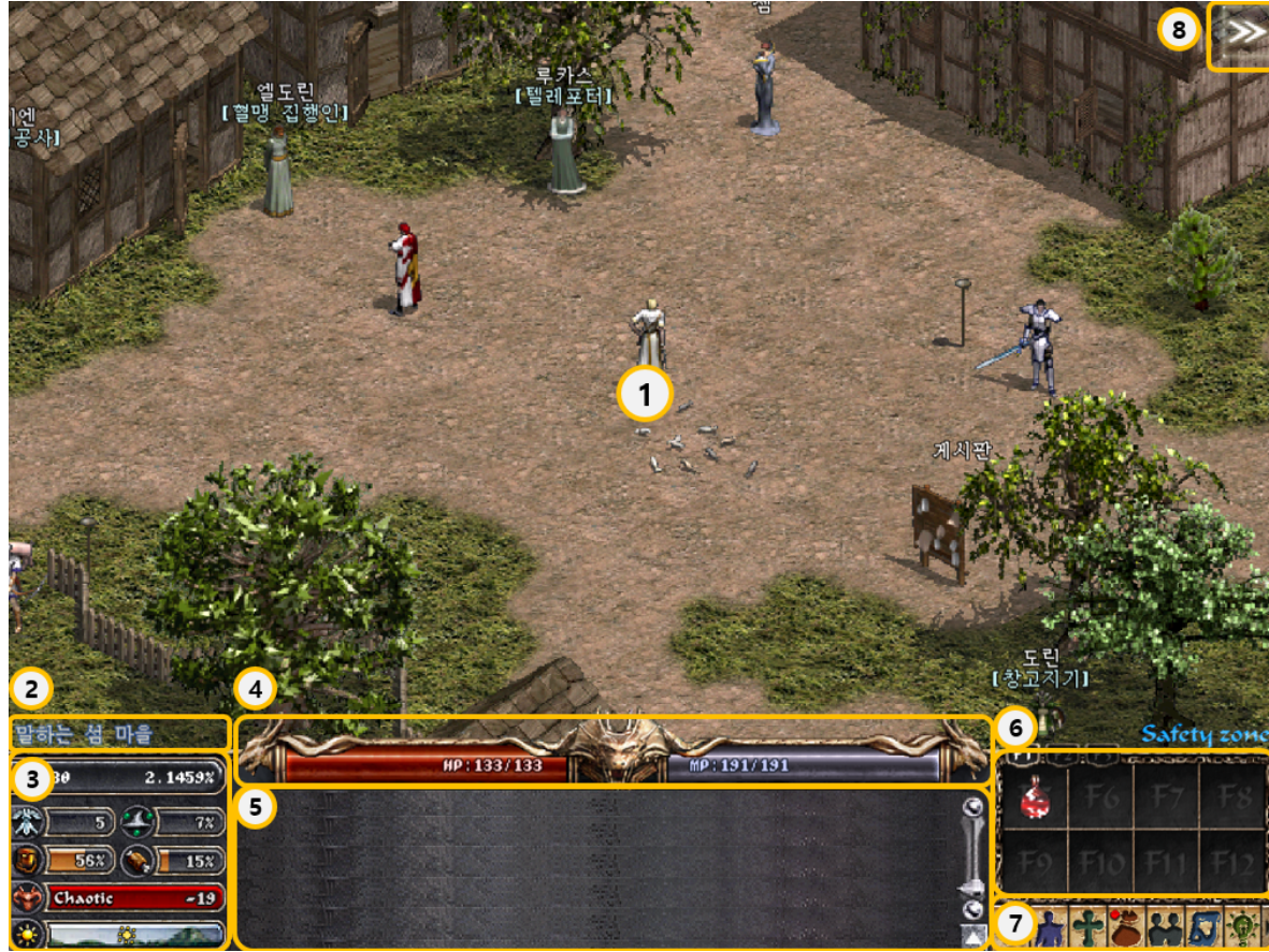 [리니지 클래식] ◆메뉴 및 UI 소개 ◆ 기본 화면 구성, 인터페이스, 캐릭터 정보창, 인벤토리와 마법창까지 안내해 드립니다.리니지 클래식 초보자를 위한 메뉴 및 UI를 소개해 드리며 기본 화면 구성, 인터페이스, 캐릭터 정보창, 인벤토리와 마법창 정보까지 확인해 보세요! 게임정보는 NCER, NCER에서 알려드리는 리니지 클래식 게임소식 입니다. 이 답변은 AI가 생성한 정보입니다. 실제 게임 내용과 다를 수 있으며, 정확한 정보는 반드시 공식 채널에서 확인해주세요. 작성 기준일 : 2026.02.07 ● 기본 화면 구성 <리니지 클래식>의 게임 화면을 소개한다. 가장 큰 부분을 차지하고 있는 게임 화면을 중심으로 하단에 캐릭터의 능력치 및 채팅화면, 단축 키 등이 배치되어 있다. 각 메뉴의 기능을 잘 알고 있다면 그만큼 게임 플레이가 편리해진다. ① 게임 화면: 실제 게임이 진행되고 있는 화면. ② 캐릭터 위치: 캐릭터가 위치하고 있는 마을/사냥터 등을 확인할 수 있다. ③ 캐릭터 상태: 캐릭터 레벨 및 경험치(%), 능력치 등을 확인할 수 있다. ④ HP/MP: 캐릭터의 HP 및 MP를 확인할 수 있다. ⑤ 채팅창: 채팅이 표시되는 곳. ⑥ 단축키창: 게임 진행에 필요한 아이템 및 마법을 지정해놓는 곳. 상단의 [F1], [F2], [F3] 버튼을 클릭해 3개의 단축키창을 선택한다. ⑦ 메뉴: 게임 진행에 필요한 메뉴. 순서대로 알림, 캐릭터, 마법, 인벤토리, 커뮤니티, 지도, 행동, 설정, 종료. ⑧ 버프: 캐릭터가 받고 있는 버프를 확인할 수 있다. ● 인터페이스 * 캐릭터 상태 ① 레벨과 경험치: 캐릭터의 레벨 및 경험치(%) ② 방어력: 캐릭터의 방어력(AC) ③ 마법 방어: 캐릭터의 마법 방어(MR) ④ 무게 게이지: 캐릭터의 인벤토리에 들어있는 아이템의 전체 무게 ⑤ 포만감 게이지: 캐릭터의 포만감 ⑥ 성향치: 캐릭터의 성향치(라우풀, 뉴트럴, 카오틱). 성향에 따라 왼쪽 아이콘이 변한다. ⑦ 낮/밤 시간: 리니지 클래식에서의 시간을 확인할 수 있다. 시간 흐름에 따라 아이콘이 좌→우로 이동한다. * HP/MP 바 ① HP: 캐릭터의 현재/최대 HP를 표시한다. ② MP: 캐릭터의 현재/최대 MP를 표시한다. * 채팅창 ① 채팅창: 채팅 내용이 표시된다. ② 채팅창 스크롤: 지나간 채팅 내용을 확인할 수 있다. ③ 한/영 전환: 한글과 영문으로 전환한다. ④ 채팅창 크기: 버튼 클릭 또는 단축키(Ctrl+T)를 통해 채팅창 크기를 조절할 수 있다. 기본은 4줄이며, 클릭할 때마다 6줄, 8줄로 늘어난다. * 단축키창 및 메뉴 ① 단축키 세트: F1~F3키에 대응하는 단축키 세트로, 총 3세트, 24개의 단축키를 지정할 수 있다. ② 단축키창: F5 ~ F12키에 대응하는 단축키로, 아이템과 마법을 지정해 사용할 수 있다. ③ 게임 메뉴: 게임 진행에 필요한 메뉴로, [알림], [캐릭터], [마법], [인벤토리], [커뮤니티], [지도], [행동], [설정], [종료] 버튼으로 구성되어 있다. ● 캐릭터 정보창 ① 레벨과 경험치: 캐릭터의 레벨 및 경험치(%) ② 항목에서 확인 가능한 정보는 다음과 같다. - HP/MP: 캐릭터의 현재/최대 HP/MP - 방어력: 캐릭터의 방어력(AC) ③ 항목에서 확인 가능한 정보는 다음과 같다. - 무게 게이지: 캐릭터의 인벤토리에 들어있는 아이템의 전체 무게 - 포만감 게이지: 캐릭터의 포만감 ④ 스탯: 캐릭터의 스탯(STR, DEX, CON, INT, WIS, CHA). 착용한 장비 및 버프 등의 효과에 따라 달라진다. ⑤ 매직 레벨/매직 보너스: 캐릭터의 매직 레벨(일반 마법을 습득할 수 있는 레벨)과 매직 보너스. ⑥ 속성 저향: 캐릭터의 땅(earth), 불(fire), 물(water), 바람(wind)에 대한 저항력. ⑦ 장비: 현재 캐릭터가 착용하고 있는 장비 ⑧ 성향치: 캐릭터의 성향치(라우풀, 뉴트럴, 카오틱)가 수치로 표시된다. ⑨ 항목에서 확인 가능한 정보는 다음과 같다. - ER: 캐릭터의 원거리 공격 회피 - 낮/밤 시간: 리니지 클래식에서의 시간을 확인할 수 있다. 시간 흐름에 따라 아이콘이 좌→우로 이동한다. ● 인벤토리와 마법창 ① 인벤토리: 캐릭터가 보유한 아이템을 표시한다. ② 항목에서 확인 가능한 정보는 다음과 같다. - 패스: 패스 플랜의 진행 현황을 확인할 수 있다. - 부가 아이템 창고: 웹에서 구매한 아이템을 수령할 수 있다. - 확률 보기: 확률보기가 가능한 아이템에 한해 강화 및 획득 확률을 확인할 수 있다. - 아이템 봉인: 아이템을 봉인한다. ③ 휴지통: 인벤토리에서 필요 없는 아이템을 드래그해서 삭제할 수 있다(바닥에 버리는 것과는 다르다). ④ 항목에서 확인 가능한 정보는 다음과 같다. - 마법 리스트: 캐릭터가 보유한 마법(스킬)을 표시한다. - 캐릭터가 보유한 단계별 마법은 좌측 책갈피를 클릭하여 확인할 수 있다. ⑤ S.power: Spell Power의 약자로 캐릭터가 마법을 사용했을 때 마법의 위력을 결정하는 수치를 말한다. ⑥ M.resist: Magic Resist의 약자로 캐릭터의 마법 저항 수치를 표시한다.