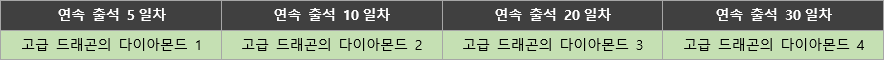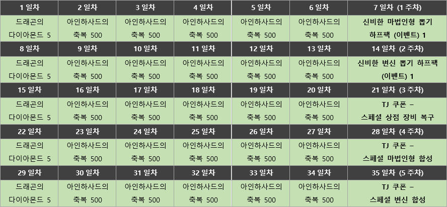 Shooting Star 출석 체크리니지M – Shooting Star: 구원의 활시위 안녕하세요, 아덴 용사님들! 메티스입니다. Shooting Star: 구원의 활시위 업데이트를 맞아, 새로운 출석체크 시즌이 찾아왔습니다. 매일매일 출석하고 TJ’s COUPON을 포함한 다양한 보상을 획득하세요! ■ 이벤트 일정 - 2023. 3. 22. (수) 정기점검 후 ~ 별도 안내 시 ■ 이벤트 내용 상세 1) 일간 출석 보상 - 일일 출석 보상은 서버 구분없이 동일한 보상이 제공됩니다. - 35일차 출석체크 완료 시, 36일차부터 시즌 종료까지 일간 출석 보상으로 ‘아인하사드의 축복 500’을 획득하실 수 있습니다. 2) 연속 출석 보상 - 매 5일마다 고급 드래곤의 다이아몬드를 획득할 수 있습니다. 3) 보상 아이템 상세 ■ 필독! 주의사항 - 2023년 6월 28일 정기점검 이후, ‘드래곤의 다이아몬드 (이벤트)’, ‘드래곤의 고급 다이아몬드 (이벤트)’, ‘신비한 마법인형 뽑기 하프팩 (이벤트)’, ‘신비한 변신 뽑기 하프팩 (이벤트)’, ‘TJ 쿠폰 – 스페셜 상점 장비 복구’, ‘TJ 쿠폰 – 스페셜 마법인형 합성’, ‘TJ 쿠폰 – 스페셜 변신 합성’ 아이템은 삭제됩니다. - 본 이벤트는 리니지M 이벤트 규약을 따릅니다. [자세히 보기] |