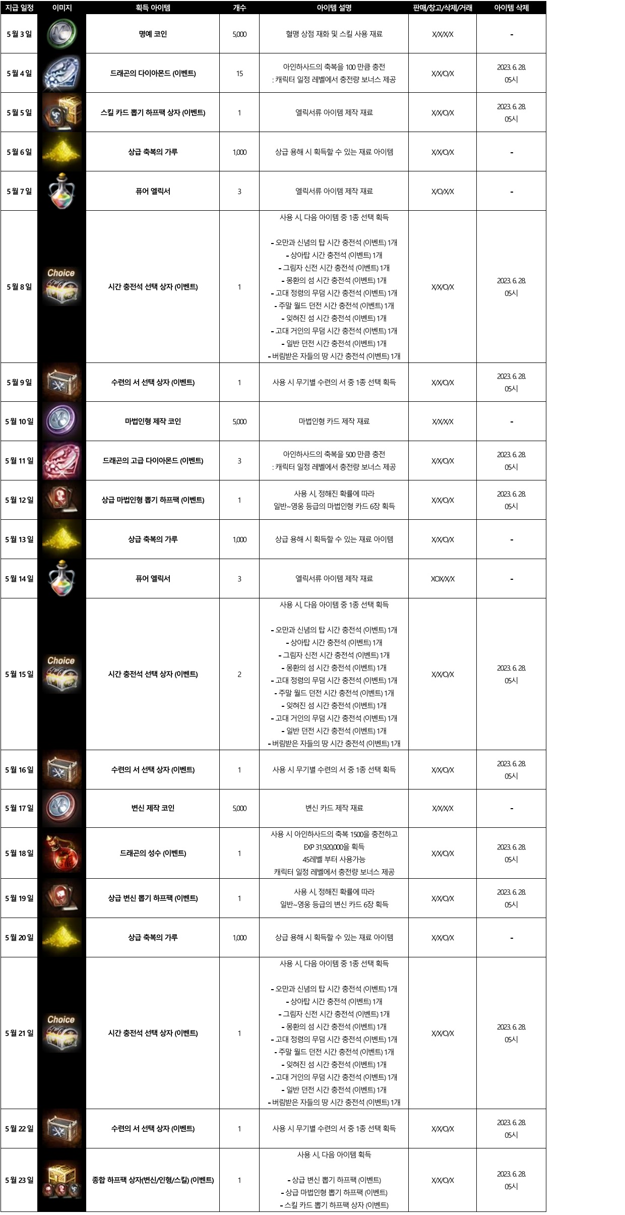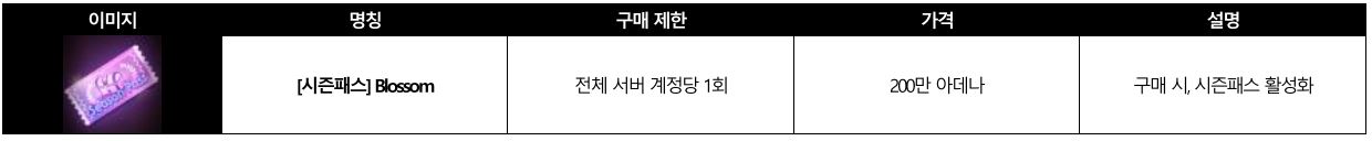 Blossom시즌패스리니지M - Shooting Star: 구원의 활시위 안녕하세요, 메티스입니다. 따뜻한 봄을 즐기는 Blossom 시즌패스를 만나보세요. 상급 변신/마법인형 뽑기 하프팩, 퓨어 엘릭서 등 다양한 아이템을 획득할 수 있으니 기회를 놓치지 마세요! ■ 이벤트 일정 - 2023. 5. 3. (수) ~ 2023. 5. 31. (수) 정기점검 전 ■ 이벤트 내용 상세 1) 이벤트 아이템 ‘[시즌패스] Blossom’ - 이벤트 기간 동안 이벤트 아이템 ‘[시즌패스] Blossom’을 [상점 - 이벤트] 탭에서 아데나로 구매할 수 있습니다. - ‘[시즌패스] Blossom’ 구매 시, 출석체크 내 시즌패스 기능이 활성화되어 매일 특별한 혜택을 획득할 수 있습니다. 2) 시즌패스 보상 - ‘[시즌패스] Blossom’구매 시, [출석체크] > [시즌패스] 탭에서 매일 특별한 혜택을 획득할 수 있습니다. - 각 회차 활성화 일정에 맞추어 출석하지 않더라도, 수령하지 않은 이전 회차의 혜택까지 모두 획득할 수 있습니다. - 2023년 5월 31일 (수) 정기점검 전까지만 시즌패스 혜택을 수령할 수 있습니다. [시즌패스 보상 상세] ■ 필독! 주의사항 - 2023년 5월 31일 정기점검 이후, 상점에서 ‘[시즌패스] Blossom’을 구매할 수 없으며, ‘시즌패스’ 혜택도 수령할 수 없습니다. - 2023년 6월 28일 정기점검 이후, ‘드래곤의 다이아몬드 (이벤트)’, ’드래곤의 고급 다이아몬드 (이벤트)’, ‘드래곤의 성수 (이벤트)’, ‘스킬 카드 뽑기 하프팩 상자 (이벤트)’, ‘시간 충전석 선택 상자 (이벤트)’, ‘수련의 서 선택 상자 (이벤트)’, ‘상급 마법인형 뽑기 하프팩 (이벤트)’, ‘상급 변신 뽑기 하프팩 (이벤트)’, ‘종합 하프팩 상자(변신/인형/스킬) (이벤트)’는 모두 삭제됩니다. - 본 이벤트는 리니지M 이벤트 규약을 따릅니다. [자세히 보기] |