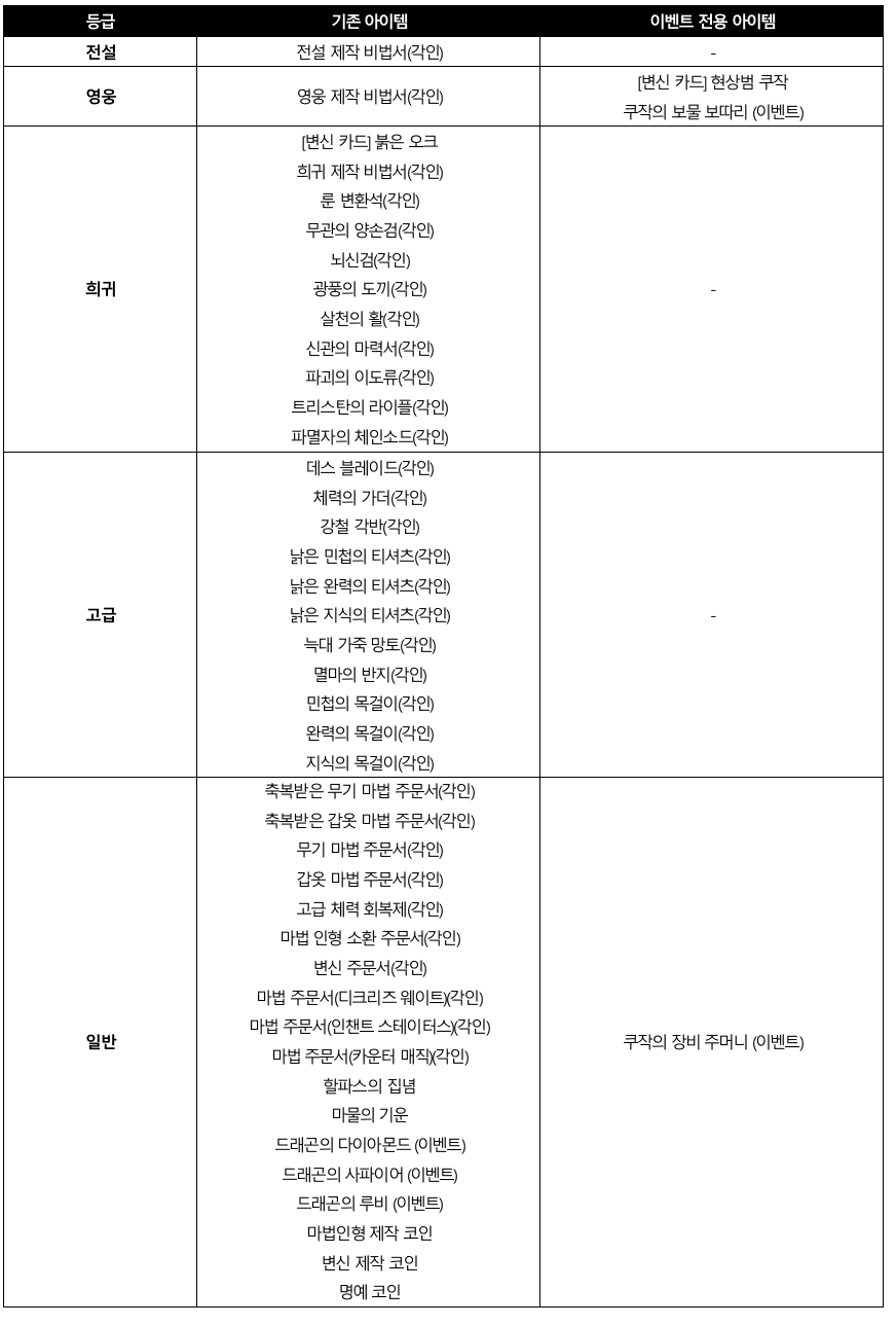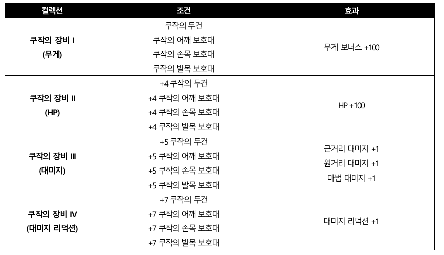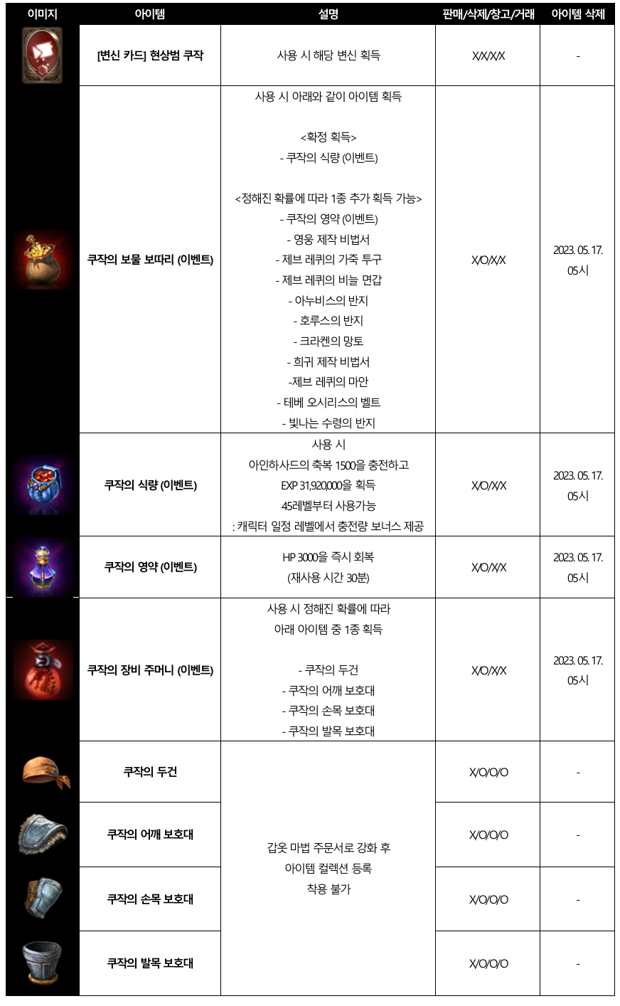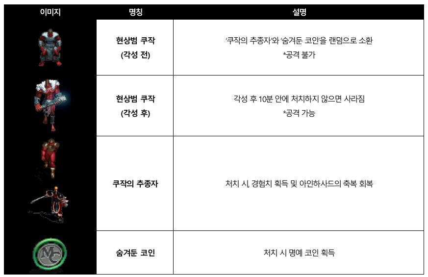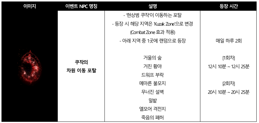 현상범 쿠작 레이드리니지M - Shooting Star: 구원의 활시위 안녕하세요, 메티스입니다. 신들의 보물을 손에 넣고 강력해진 ‘현상범 쿠작’이 차원 이동 포탈과 함께 다시 등장합니다! ‘현상범 쿠작’과 그의 추종자들로부터 아덴 월드를 수호하고, 진귀한 보상을 획득하세요! ■ 이벤트 일정 ■ 이벤트 요약 - 이벤트 기간 중 매일 하루 2번, ‘현상범 쿠작’이 아덴 대륙 필드 8곳 중 1곳에 랜덤으로 등장합니다. - 주어진 시간 내에 각성한 ‘현상범 쿠작’을 처치하면, 이벤트 전용 신규 아이템을 포함해 다양한 보상을 획득할 수 있습니다. ■ 이벤트 내용 상세 1) ‘쿠작의 차원 이동 포탈' - 이벤트 기간 중 매일 하루 두 번, 아덴 대륙 필드 8곳 중 1곳에 랜덤으로 ‘쿠작의 차원 이동 포탈’이 등장합니다. - ‘쿠작의 차원 이동 포탈’이 등장한 지역은 ‘Kuzak Zone’으로 변경되며, Combat Zone 효과가 적용됩니다. - ‘쿠작의 차원 이동 포탈’은 등장하기 10분 전 사전 안내가 진행됩니다. [이벤트 NPC ‘쿠작의 차원 이동 포탈’] 2) ‘현상범 쿠작’ 레이드 - 이벤트가 시작되면 ‘쿠작의 차원 이동 포탈’에서 ‘현상범 쿠작’이 등장합니다. - ‘현상범 쿠작’은 등장 후 5분간 ‘쿠작의 추종자’와, ‘숨겨둔 코인’을 랜덤하게 소환합니다. - ‘쿠작의 추종자’를 처치하면 경험치와 아인하사드 회복 효과를, ‘숨겨둔 코인’을 처치하면 명예 코인을 획득하실 수 있습니다. - ‘현상범 쿠작’이 등장한 지 5분이 지나면 각성하여 공격할 수 있습니다. - 각성한 ‘현상범 쿠작’을 처치하면 다양한 아이템을 획득하실 수 있습니다. - 전체 이벤트는 15분 동안 진행되며, 해당 시간 내에 각성한 ‘현상범 쿠작’이 처치되면 이벤트는 조기 종료됩니다. [이벤트 몬스터 상세] 3) 보상 아이템 - 각성한 ‘현상범 쿠작’은 처치 시 각종 보상 아이템을 확률적으로 드랍합니다. - 이 중 ‘쿠작의 장비 주머니 (이벤트)’에서 획득 가능한 장비 아이템 4종은 아이템 컬렉션에 등록 가능합니다. (착용 불가) [드랍 아이템 상세] [이벤트 전용 아이템 상세] [쿠작의 장비 컬렉션] ■ 필독! 주의사항 - 2023년 5월 17일 정기점검 이후, 이벤트 NPC ‘쿠작의 차원 이동 포탈’, ‘현상범 쿠작’, ‘쿠작의 추종자’, ‘숨겨둔 코인’은 등장하지 않습니다. - 2023년 5월 17일 정기점검 이후, 이벤트 아이템 ‘쿠작의 보물 보따리 (이벤트)’, ‘쿠작의 장비 주머니 (이벤트)’, ‘쿠작의 식량 (이벤트)’, ‘쿠작의 영약 (이벤트)’, ‘드래곤의 다이아몬드 (이벤트)’, ‘드래곤의 사파이어 (이벤트)’, ‘드래곤의 루비 (이벤트)’는 모두 삭제됩니다. - 본 이벤트는 리니지M 이벤트 규약을 따릅니다. [자세히 보기] |