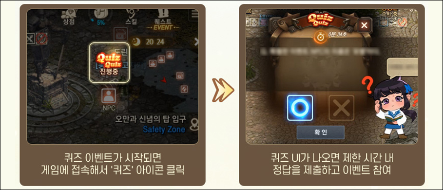 [‘6주년 기념 주화 (이벤트)’ 안내] ■ 이벤트 참여 방법 - ‘퀴즈 퀴즈’는 게임 내에서 진행되는 퀴즈 콘텐츠로, 이벤트가 시작되면 미니맵 좌측에 ‘퀴즈 퀴즈’ 아이콘이 등장합니다. - ‘퀴즈 퀴즈’ 아이콘을 클릭하면 퀴즈 UI가 등장하며, 정답을 제출할 수 있습니다. - ‘퀴즈 퀴즈’ 이벤트에서 출제되는 문제는 OX 퀴즈로 구성되어 있으며 총3문제가 출제됩니다. - ‘퀴즈 퀴즈’ 이벤트 정답 제출 시간은 60초입니다. - 다음 퀴즈는 전 차수가 종료된 이후 60초 뒤에 출제됩니다. - 각 문항별 제한 시간 내에 정답을 제출 후 정답을 맞히면 우편을 통해 정답 보상이 지급됩니다. (계정당 1회 지급) [참여 방법 상세] ■ 필독! 주의사항 - 30일 이내 접속 기록이 있는 60레벨 이상의 용사님께 우편함을 통해 이벤트 푸시 보상이 지급됩니다. - 이벤트 푸시 우편은 발송 당일 23시 59분까지 수령할 수 있으며, 이후 해당 우편은 삭제됩니다. - 퀴즈 별 보상은 정답을 맞힐 경우 실시간 우편으로 발송되며, 전체 서버 기준 계정당 1회 지급됩니다. - 퀴즈 별 정답 보상 우편은 발송 후 24시간 이내 수령할 수 있으며, 이후 해당 우편은 삭제됩니다. - 각 문항 별 제한 시간이 있으며, 제한 시간 내 정답을 제출하지 못하거나 오답을 제출한 경우 보상이 지급되지 않습니다. - 답안 선택 후 [확인] 버튼을 눌러야 정답 및 이벤트 참여가 인정되며, 제출 후에는 답안 수정이 불가합니다. - 퀴즈 진행 중 인벤토리/스킬 창 등을 클릭할 경우 퀴즈 UI는 닫히지만, '퀴즈 퀴즈' 아이콘을 다시 클릭하여 참여할 수 있습니다. - 절전 모드 화면에서는 이벤트 진행에 대한 안내가 되지 않습니다. - 지급 아이템인 ‘6주년 기념 주화 (이벤트)’ 아이템은 2023년 7월 5일 정기점검 이후 삭제됩니다. - 내부 사정에 따라 이벤트 내용이 변경될 수 있습니다. - 본 이벤트는 리니지M 이벤트 규약을 따릅니다. [자세히 보기] |