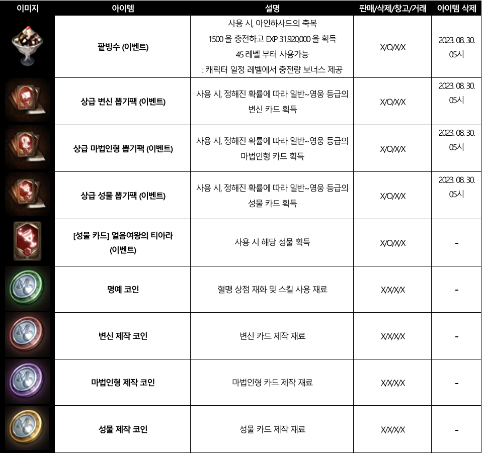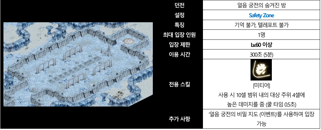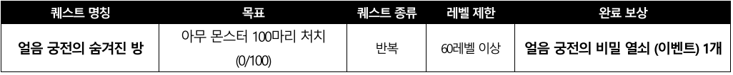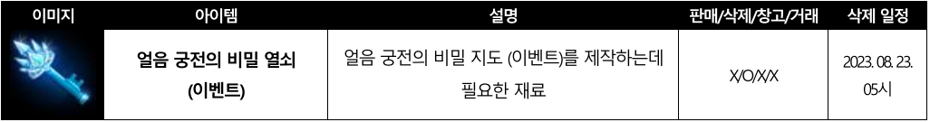 얼음 궁전의 숨겨진 방리니지M - THE DIVINE: 빛의 심판 안녕하세요, 메티스입니다. 한 여름 무더위를 날려줄 <얼음 궁전의 숨겨진 방> 이벤트가 시작됩니다! 얼음 궁전의 숨겨진 방에서 얼어붙은 몬스터를 처치하고, 다양한 보상을 획득하세요! ■ 이벤트 일정 - 2023. 8. 16. (수) 정기점검 후 ~ 2023. 8. 23. (수) 정기점검 전 ■ 이벤트 내용 상세 1) 이벤트 퀘스트 ‘얼음 궁전의 숨겨진 방’ - 이벤트 기간 동안 Lv.60 이상 캐릭터는 이벤트 퀘스트 ‘얼음 궁전의 숨겨진 방’을 수행할 수 있습니다. - 이벤트 퀘스트 완료 시, ‘얼음 궁전의 비밀 열쇠 (이벤트)’를 획득할 수 있습니다. - ‘얼음 궁전의 비밀 열쇠 (이벤트)’는 매일 캐릭터 당 1회에 한해 ‘축복의 가루’ 100개와 50만 아데나를 재료로 추가 제작 가능합니다. [이벤트 퀘스트 ‘얼음 궁전의 숨겨진 방’] [이벤트 퀘스트 보상] 2) 이벤트 제작 재료 ‘얼음 궁전의 비밀 지도 (이벤트)’ - 퀘스트 보상 및 제작으로 획득한 ‘얼음 궁전의 비밀 열쇠 (이벤트)’ 1개와 10만 아데나를 이용하여, ‘얼음 궁전의 비밀 지도 (이벤트)’를 제작 할 수 있습니다. - 제작한 비밀 지도를 사용하면 이벤트 던전 ‘얼음 궁전의 숨겨진 방’에 입장할 수 있습니다. - ‘얼음 궁전의 비밀 지도 (이벤트)는 이벤트 기간 동안 캐릭터당 총 14회까지 제작 가능합니다. [제작 아이템 상세] 3) 이벤트 던전 ‘얼음 궁전의 숨겨진 방’ - 이벤트 기간 동안 Lv.60 이상 캐릭터를 통해 이벤트 던전 ‘얼음 궁전의 숨겨진 방’을 이용할 수 있습니다. - 입장 후, 제한된 시간인 60초 안에 ‘얼음 궁전의 숨겨진 방’에 출현하는 얼어붙은 몬스터를 처치하면 ‘숨겨둔 얼음 상자’가 등장합니다. - ‘숨겨둔 얼음 상자’를 처치하면, ‘[성물 카드] 얼음 여왕의 티아라 (이벤트)’, ‘상급 성물 뽑기팩 (이벤트)’ 등 다양한 보상을 획득할 수 있습니다. [이벤트 던전 ‘얼음 궁전의 숨겨진 방’] [‘얼음 궁전의 숨겨진 방’ 드랍 아이템 상세] ■ 필독! 주의사항 - 2023년 8월 23일 정기점검 이후, 이벤트 퀘스트 ‘얼음 궁전의 숨겨진 방’을 진행할 수 없습니다. - 2023년 8월 23일 정기점검 이후, 이벤트 던전 ‘얼음 궁전의 숨겨진 방’에 입장할 수 없습니다. - 2023년 8월 23일 정기점검 이후, 이벤트 아이템 ‘얼음 궁전의 비밀 열쇠 (이벤트)’, ‘얼음 궁전의 비밀 지도 (이벤트)’는 삭제됩니다. - 2023년 8월 30일 정기점검 이후, 이벤트 아이템 ‘팥빙수 (이벤트)’, ‘상급 변신 뽑기팩 (이벤트)’, ‘상급 마법인형 뽑기팩 (이벤트)’, ‘상급 성물 뽑기팩 (이벤트)’는 삭제됩니다. - 본 이벤트는 리니지M 이벤트 규약을 따릅니다. [자세히 보기] |