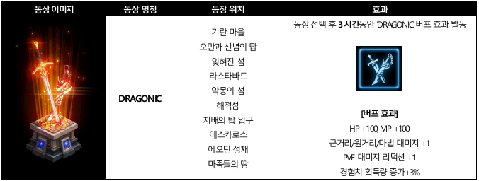 DRAGONIC 버프 동상리니지M - DRAGONIC: 용의 진노 안녕하세요, 메티스입니다. 투사와 군주의 클래스 리부트를 기념하여 아덴 월드 곳곳에 이벤트 동상이 등장합니다! 동상을 터치하고 다양한 능력치를 제공하는 ‘DRAGONIC’ 버프 효과를 받아보세요. ■ 이벤트 일정 - 2023. 9. 20. (수) 정기점검 후 ~ 2023. 10. 18. (수) 정기점검 전 ■ 이벤트 내용 상세 1) 버프 동상 ‘DRAGONIC’ - 이벤트 기간, 기란 마을, 오만과 신념의 탑, 잊혀진 섬, 라스타바드, 악몽의 섬, 해적섬, 지배의 탑 입구, 에스카로스, 에오딘 성채, 마족들의 땅에 ‘DRAGONIC’ 동상이 등장합니다. - 동상을 선택해 ‘DRAGONIC’ 버프를 획득할 수 있습니다. - 버프는 동상 선택 직후 발동해 3시간동안 지속되며, 효과는 아래와 같습니다. [이벤트 동상 ‘DRAGONIC’] ■ 필독! 주의사항 - 2023년 10월 18일 정기점검 이후, 이벤트 동상 ‘DRAGONIC’은 더 이상 등장하지 않습니다. - 본 이벤트는 리니지M 이벤트 규약을 따릅니다. [자세히 보기] |