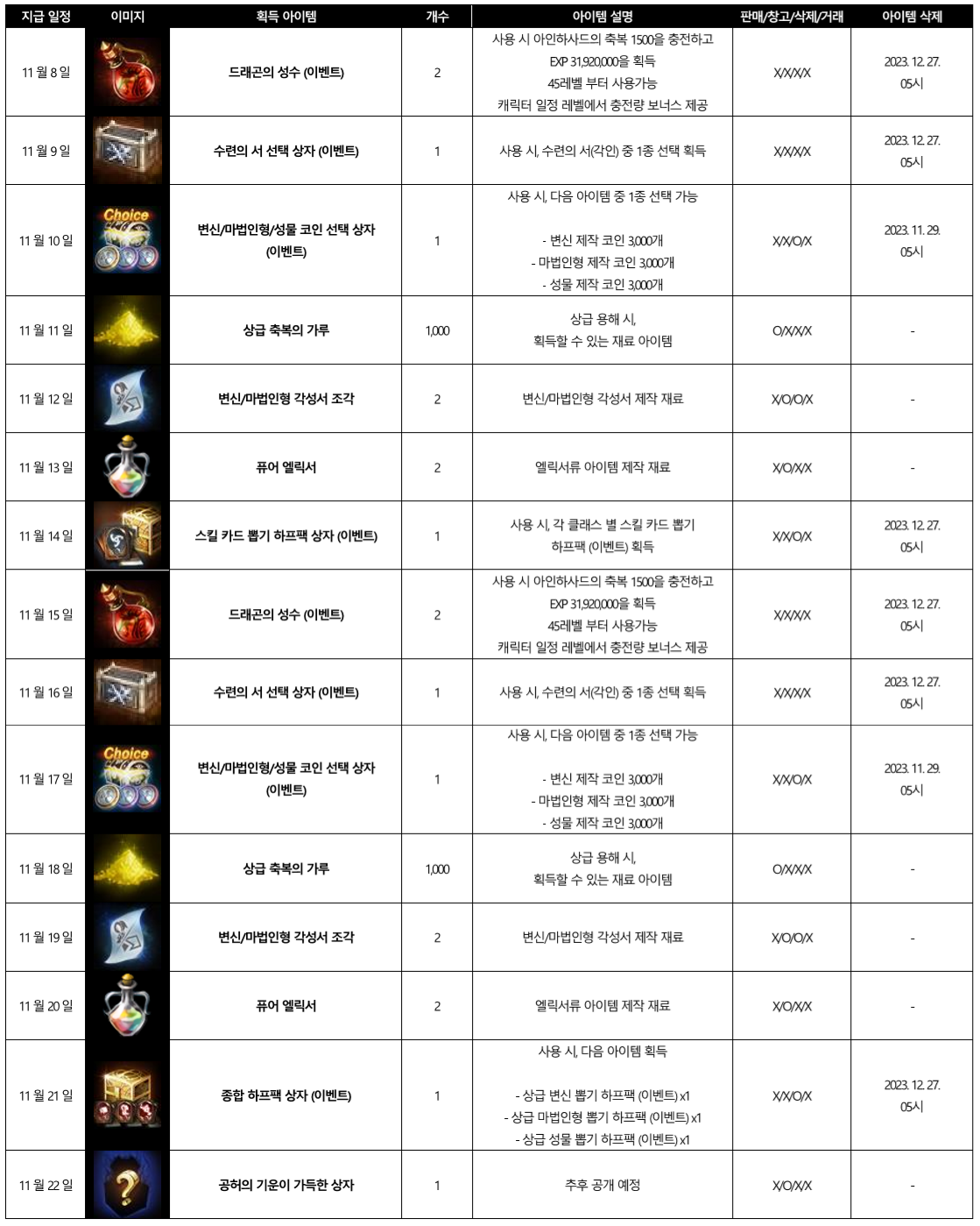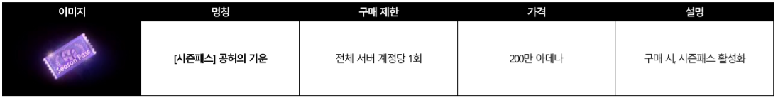 공허의 기운 시즌패스리니지M - DRAGONIC: 용의 진노 안녕하세요, 메티스입니다. 다가오는 미지의 힘을 대비하기 위해 공허의 기운 시즌패스가 시작됩니다. 지금 바로 상점에서 ‘[시즌패스] 공허의 기운’을 구매하고, 매일매일 쏟아지는 특별한 혜택을 놓치지 마세요! ■ 이벤트 일정 - 2023. 11. 8. (수) ~ 2023. 11. 29. (수) 정기점검 전 ■ 이벤트 내용 상세 1) 이벤트 아이템 ‘[시즌패스] 공허의 기운’ - 이벤트 기간 동안 이벤트 아이템 ‘[시즌패스] 공허의 기운’을 [상점 - 이벤트] 탭에서 아데나로 구매할 수 있습니다. - ‘[시즌패스] 공허의 기운’ 구매 시, 출석체크 내 시즌패스 기능이 활성화되어 매일 특별한 혜택을 획득할 수 있습니다. 2) 시즌패스 보상 - ‘[시즌패스] 공허의 기운’ 구매 시, [출석체크] > [시즌패스] 탭에서 매일 특별한 혜택을 획득할 수 있습니다. - 각 회 차 활성화 일정에 맞추어 출석하지 않더라도, 수령하지 않은 이전 회 차의 혜택까지 모두 획득할 수 있습니다. - 2023년 11월 29일 (수) 정기점검 전 까지만 시즌패스 혜택을 수령할 수 있습니다. [시즌패스 보상 상세] ■ 필독! 주의사항 - 2023년 11월 29일 정기점검 이후, 상점에서 ‘[시즌패스] 공허의 기운’을 구매할 수 없으며, 시즌패스 혜택도 수령할 수 없습니다. - 2023년 11월 29일 정기점검 이후, ‘변신/마법인형/성물 코인 선택 상자 (이벤트)’는 삭제됩니다. - 2023년 12월 27일 정기점검 이후, ‘드래곤의 성수 (이벤트)’, ‘수련의 서 선택 상자 (이벤트)’, ‘스킬 카드 뽑기 하프팩 상자 (이벤트)’, ‘종합 하프팩 상자 (이벤트)’는 모두 삭제됩니다. - 본 이벤트는 리니지M 이벤트 규약을 따릅니다. [자세히 보기] |