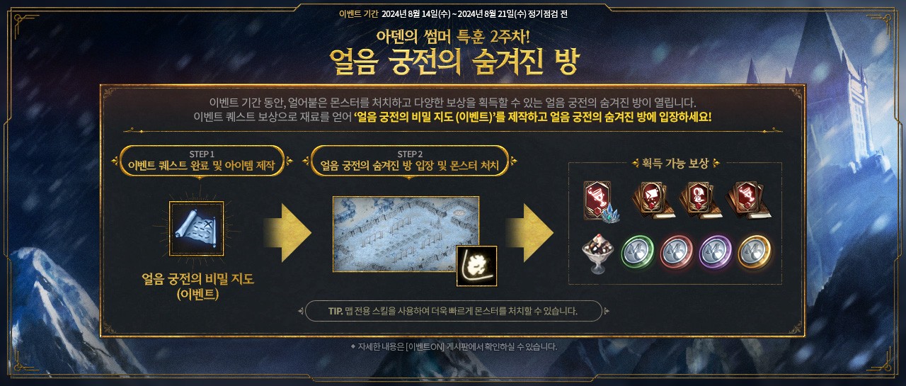 얼음 궁전의 숨겨진 방더운 여름을 시원하게 날려버릴 <얼음 궁전의 숨겨진 방> 던전이 오픈됩니다. 이벤트 던전에 입장해 ‘얼어붙은 몬스터’를 처치하고, 영웅 성물 카드를 비롯한 다양한 아이템 획득에 도전하세요! ■ 이벤트 일정 - 2024. 8. 14. (수) 정기점검 후 ~ 2024. 8. 21. (수) 정기점검 전 ■ 이벤트 내용 상세 1) 이벤트 퀘스트 ‘얼음 궁전의 숨겨진 방’ - 이벤트 기간 동안 Lv.60 이상 캐릭터는 이벤트 퀘스트 ‘얼음 궁전의 숨겨진 방’을 수행할 수 있습니다. - 이벤트 퀘스트 완료 시, ‘얼음 궁전의 비밀 열쇠 (이벤트)’를 획득할 수 있습니다. - ‘얼음 궁전의 비밀 열쇠 (이벤트)’는 매일 캐릭터 당 1회에 한해 <축복의 가루 100개 + 50만 아데나> 또는 <상급 축복의 가루 20개 + 50만 아데나>를 재료로 추가 제작 가능합니다. [이벤트 퀘스트 ‘얼음 궁전의 숨겨진 방’]