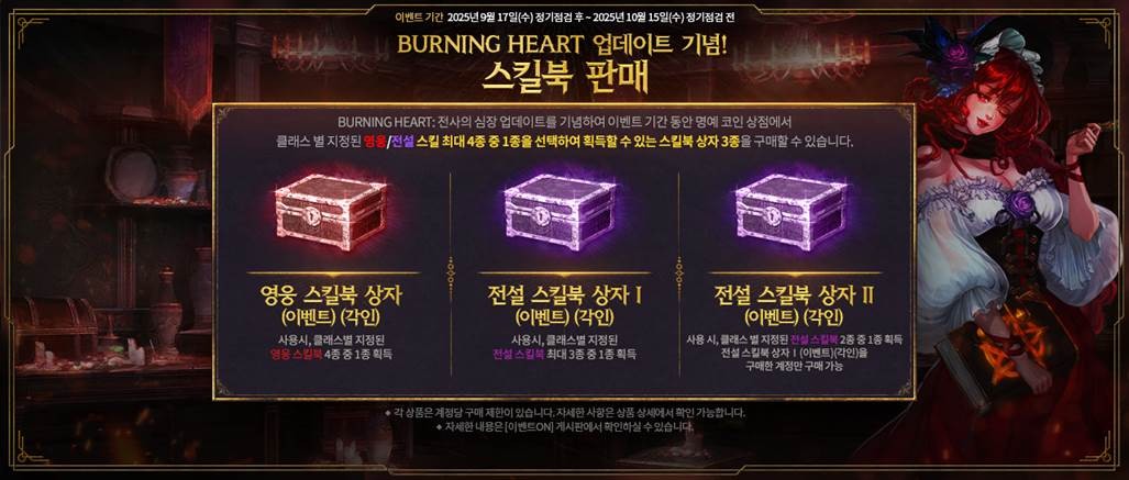 BURNING HEART: 전사의 심장 업데이트를 기념하여 명예 코인 상점에서 클래스별 영웅/전설 스킬북 상자를 판매합니다.