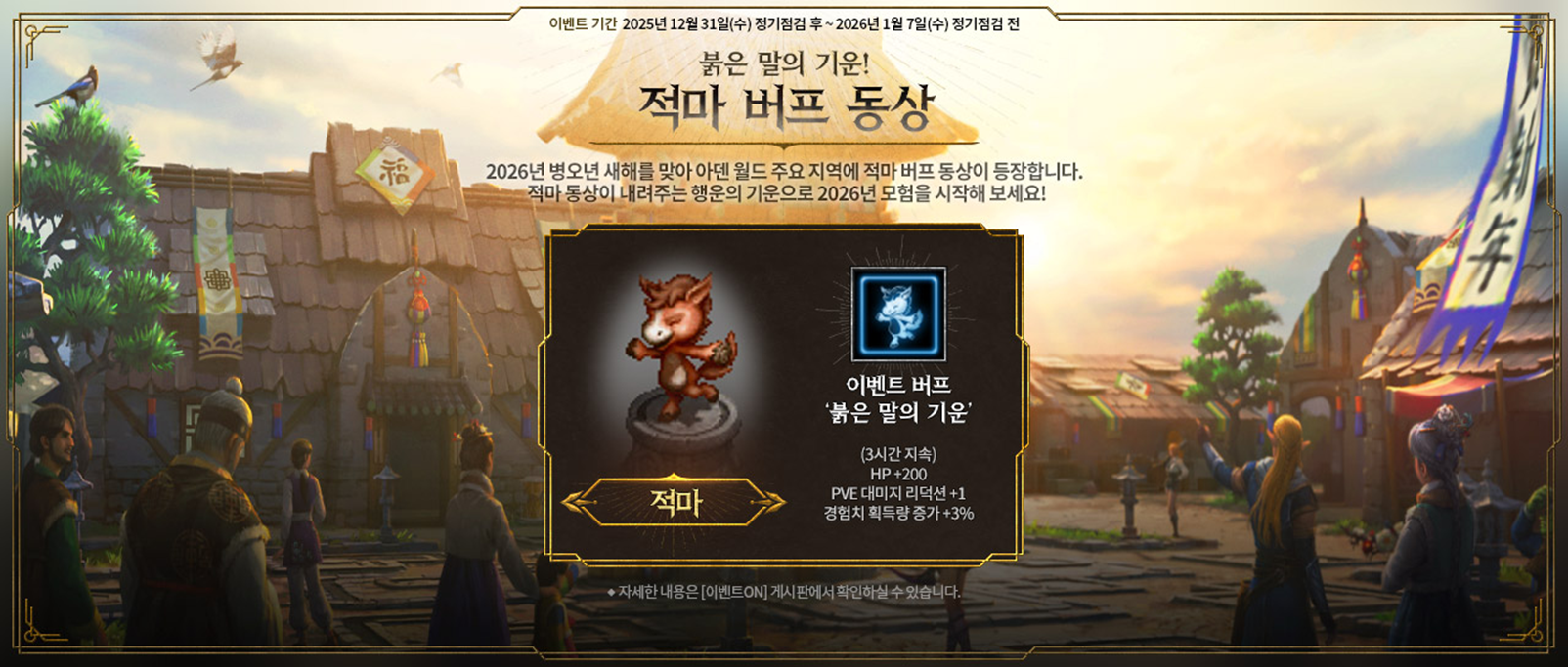 적마 버프 동상 (~1/7)병오년을 맞이하여 아덴 월드에 버프 동상이 등장합니다. 적마 버프 동상을 터치하고 성장에 도움이 되는 버프를 받아보세요! ■ 이벤트 일정 - 2025. 12. 31. (수) 정기점검 후 ~ 2026. 1. 7. (수) 정기점검 전 ■ 이벤트 내용 상세 1) 버프 동상 ‘적마’ - 이벤트 기간, 기란 마을, 오만과 신념의 탑, 에스카로스, 잊혀진 섬, 테베라스 사막, 티칼 사원, 아틀란티스, 라스타바드, 악몽의 섬, 해적섬, 혼돈의 개미굴, 기억의 섬, 지배의 탑 입구, 에오딘 성채, 마족들의 땅에 ‘적마’ 동상이 등장합니다. - 동상을 선택해 이벤트 버프 ‘붉은 말의 기운’을 획득할 수 있습니다. - 버프는 동상 선택 직후 발동해 3시간동안 지속되며, 효과는 아래와 같습니다. [이벤트 동상 ‘적마’]