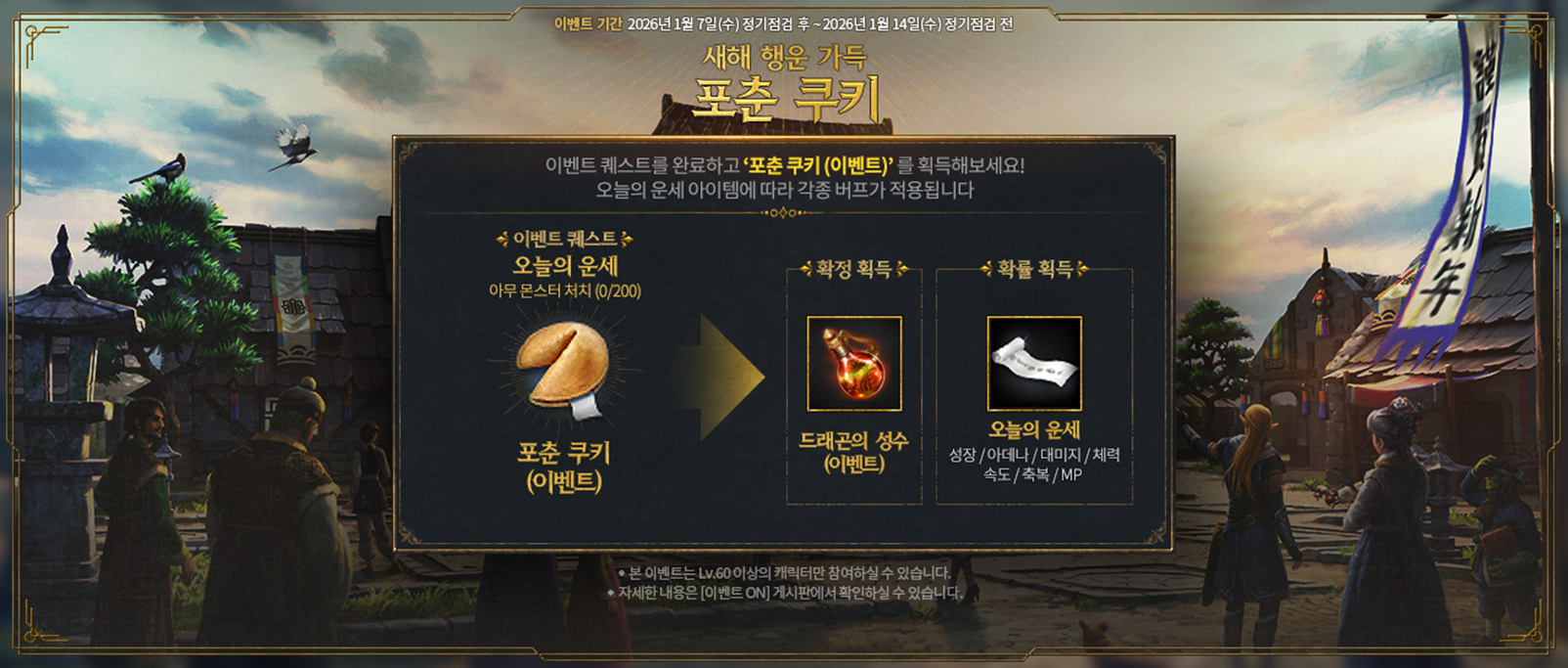 - 이벤트 기간, 계정당 Lv.60 이상의 캐릭터로 매일 1회 이벤트 퀘스트 ‘오늘의 운세’를 수행할 수 있습니다.
