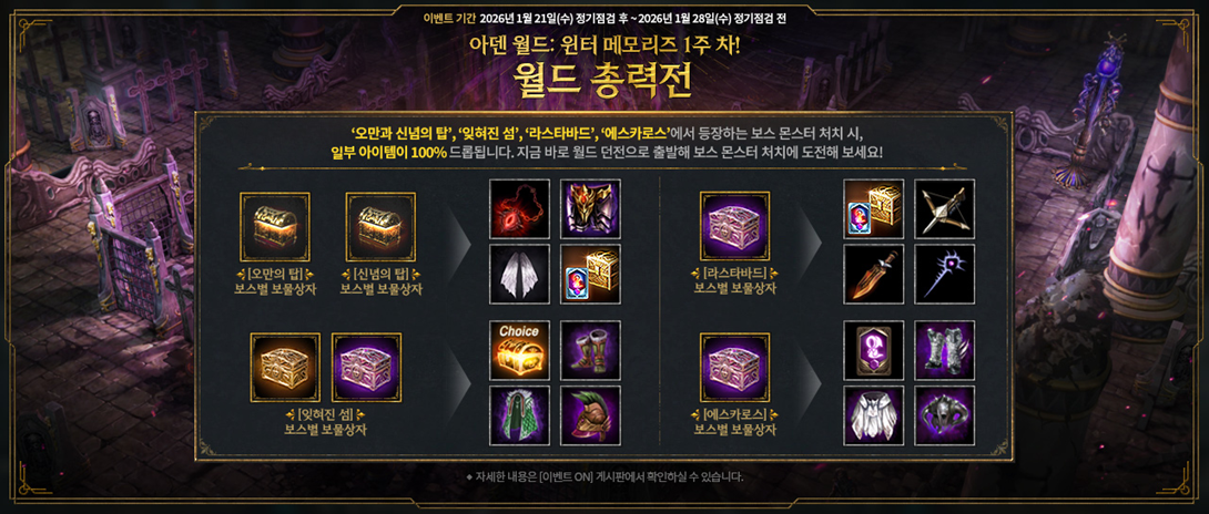 - 2026년 1월 28일 정기점검 이후, 오만과 신념의 탑, 잊혀진 섬, 라스타바드, 에스카로스 보스의 아이템 드롭률은 기존과 동일하게 변경됩니다.