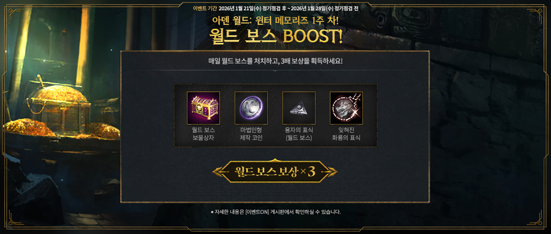 월드 보스 BOOST (~1/28)이벤트 기간, 월드 보스의 보상이 3배로 증가합니다. 매일 월드 보스에 참여하고, 강화된 보상은 물론 이벤트 퀘스트를 통한 추가 보상도 획득하세요! ■ 이벤트 일정 - 2026. 1. 21. (수) ~ 2026. 1. 28. (수) 정기점검 전 ■ 이벤트 내용 상세 1) 월드 보스 보상 3배 강화 - 이벤트 기간 동안 월드 보스 처치 시마다 월드 보스 보물상자, 마법인형 제작 코인, 용자의 표식(월드 보스)를 3배로 획득할 수 있습니다. - 마지막에 등장하는 ‘잊혀진 발라카스’ 만 보상을 3배로 제공합니다,.