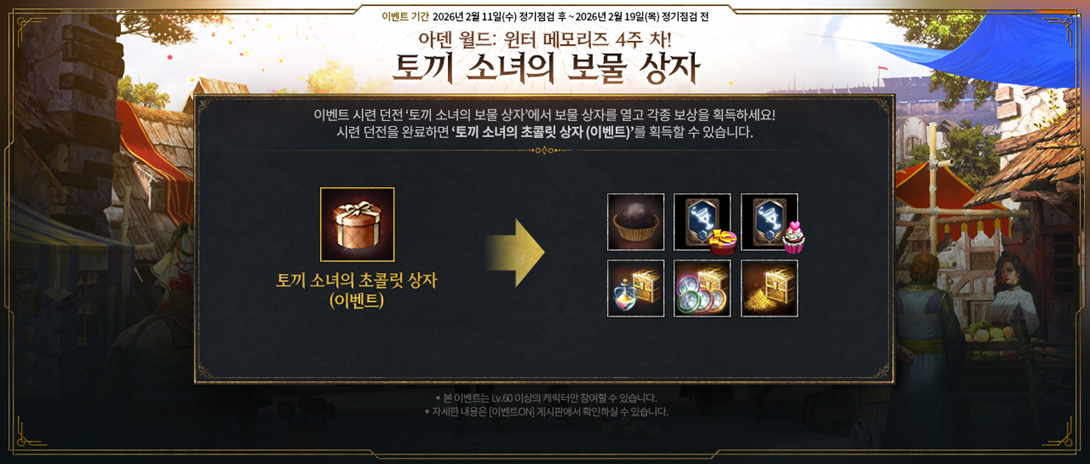 토끼 소녀의 보물 상자 (~2/19)밸런타인데이를 기념하여 이벤트 시련 던전 ‘토끼 소녀의 보물 상자’가 열립니다. 달콤한 초콜릿이 숨겨져 있는 토끼 소녀의 비밀 장소에서 보물 상자를 열고 달콤한 보상을 획득하세요! ■ 이벤트 일정 - 2026. 2. 11. (수) ~ 2026. 2. 19. (목) 정기점검 전 ■ 이벤트 내용 상세 1) 이벤트 시련 던전 ‘토끼 소녀의 보물 상자’ - 이벤트 기간 동안 60레벨 이상 캐릭터는 기존 시련 던전 외에 이벤트 시련 던전 ‘토끼 소녀의 보물 상자’를 이용할 수 있습니다. - 이벤트 기간 내 [던전] 메뉴의 [시련 던전] 탭을 통해 입장할 수 있습니다. - 제한시간 5분 내에 맵 내 ‘보물 상자’ 3개를 선택해 열면 4종 코인을 랜덤 획득하며, 완료 보상으로 경험치, 변신 제작 코인과 함께 ‘토끼 소녀의 초콜릿 상자 (이벤트)’를 획득할 수 있습니다. [이벤트 시련 던전 ‘토끼 소녀의 보물 상자’]