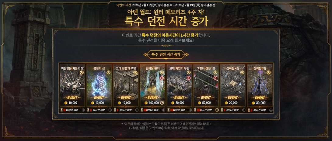 특수 던전 시간 증가 (~2/19)이벤트 기간 특수 던전의 기본 이용 시간이 한 시간 증가합니다. 특수 던전 몬스터를 더 많이 처치하고, 다양한 보상과 경험치를 획득해 보세요! ■ 이벤트 일정 - 2026. 2. 11. (수) 정기점검 후 ~ 2026. 2. 19. (목) 정기점검 전 ■ 이벤트 내용 상세 1) 특수 던전 이용 시간 증가 - 이벤트 기간 동안 과거의 말하는 섬(리부트 월드)을 제외한 특수 던전의 기본 이용 가능 시간이 각각 1시간 증가합니다. [이용 시간 증가 특수 던전]