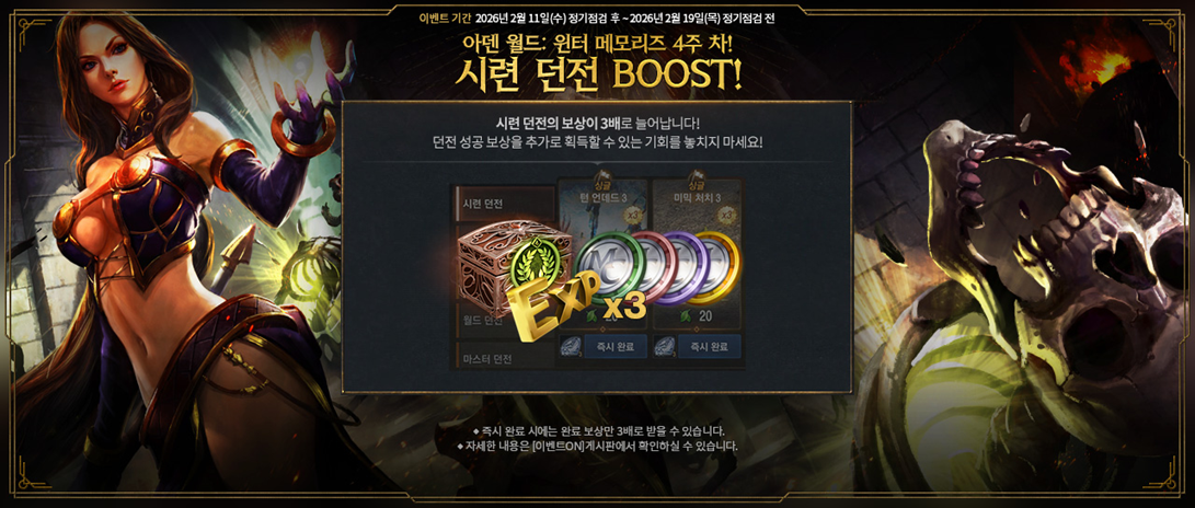 시련 던전 BOOST (~2/19)이벤트 기간, 시련 던전 턴 언데드, 미믹 처치 보상이 3배로 증가됩니다. 매일 시련 던전을 완료하고, 강화된 보상을 획득해 보세요! ■ 이벤트 일정 - 2026. 2. 11. (수) 정기점검 후 ~ 2026. 2. 19. (목) 정기점검 전 ■ 이벤트 내용 상세 1) 시련 던전 보상 3배 강화 - 이벤트 기간 동안 시련 던전 완료 시 보상 상자, 경험치를 3배로 획득할 수 있습니다. - 시련 던전 턴 언데드, 미믹 처치 진행 중 제공되는 아이템 또한 3배로 획득할 수 있습니다. - 즉시 완료 시, 완료 보상만 3배로 획득할 수 있습니다.
