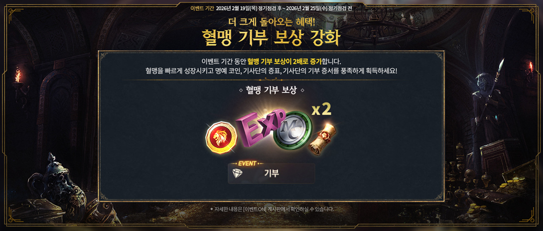 혈맹 기부 보상 강화 (~2/25)이벤트 기간 동안 혈맹 일반 기부 보상이 2배로 증가합니다. 혈맹의 번영을 위해 기부하고 더 큰 혜택을 확인하세요! ■ 이벤트 일정 - 2026. 2. 19. (목) 정기점검 후 ~ 2026. 2. 25. (수) 정기점검 전 ■ 이벤트 내용 상세 1) 혈맹 일반 등급 기부 보상 2배 - 이벤트 기간 동안 일반 등급 혈맹 기부 진행 시, 혈맹 경험치, 기사단의 기부 증서, 명예 코인, 기사단의 증표가 2배로 지급됩니다. [혈맹 일반 기부 상세]