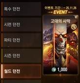 고대의 사막 (~3/18)다양한 보스 몬스터를 한자리에 만날 수 있는 이벤트 월드 던전 ‘고대의 사막’이 찾아옵니다! 이벤트 기간 동안 매주 토요일 오후 6시부터 진행되는 이벤트 던전에서 다양한 보스 몬스터를 처치하고 아이템 획득에 도전해 보세요! ■ 이벤트 일정 - 2026. 2. 25. (수) ~ 2026. 3. 18. (수) 정기점검 전 ■ 이벤트 내용 요약 1) 토요일 오후 5시 50분부터 이벤트 월드 던전 ‘고대의 사막’에 입장할 수 있습니다. - 해당 이벤트 던전은 Lv. 75 이상의 캐릭터로 최대 1,000명까지 입장할 수 있습니다. - 오후 5시 50분부터 6시까지 10분간 대기 지역에 입장 가능하며, 오후 6시부터 이벤트를 이용할 수 있습니다. 2) ‘고대의 사막’에 등장하는 보스 몬스터를 처치하면, 해당 몬스터의 보상을 정해진 확률로 드롭합니다. - 5분마다 보스 몬스터가 1마리씩 등장하며, 해당 몬스터의 보상 및 코인 상자를 획득할 수 있습니다. ■ 이벤트 내용 상세 1) 이벤트 월드 던전 ‘고대의 사막’ 입장 - 이벤트 기간, 토요일 오후 5시 50분부터 10분간 이벤트 월드 던전 ‘고대의 사막’에 입장할 수 있습니다. - 해당 던전은 [던전] > [월드 던전] 탭에서 확인할 수 있으며, Lv.75이상의 캐릭터로 1,000명예 코인을 지불하여 입장할 수 있습니다 - 또한, ‘고대의 사막’은 최대 1,000명까지 입장할 수 있습니다. - 입장시간이 종료된 이후, 더 이상 이벤트 월드 던전 ‘고대의 사막’에 입장할 수 없습니다. [이벤트 월드 던전 ‘고대의 사막’]