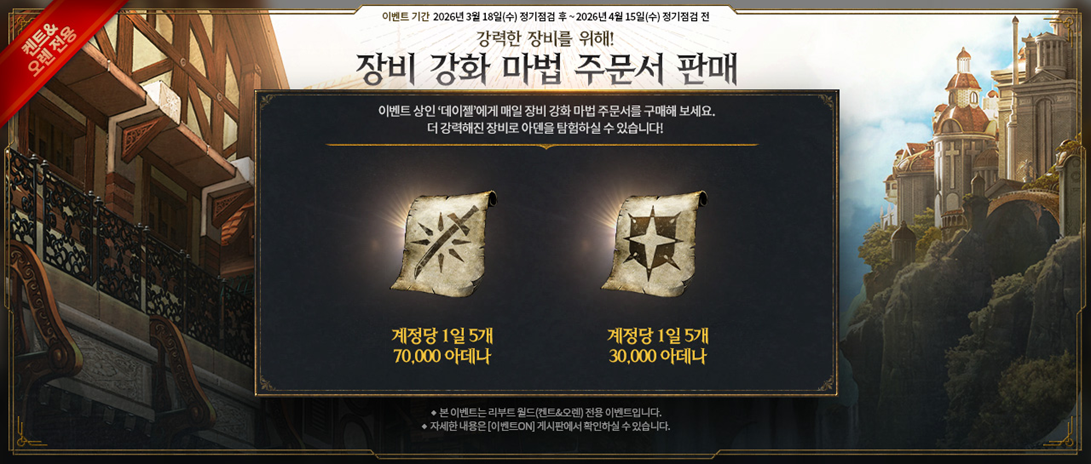 신서버 젤데이 판매 (~4/15)신서버 오렌&켄트에서 새로운 시작을 함께하는 모든 용사님들을 위해 장비 강화 주문서를 아데나로 구매할 수 있는 이벤트를 준비했습니다. 매일 장비 강화에 도전하고, 더 강해진 모습으로 신서버를 즐겨 보세요! * 본 이벤트는 신서버(켄트, 오렌) 전용입니다. ■ 이벤트 일정 - 2026. 3. 18. (수) 정기점검 후 ~ 2025. 4. 15. (수) 정기점검 전 ■ 이벤트 내용 상세 1) 장비 강화 주문서 이벤트 판매’ - 이벤트 기간, 기란 마을의 이벤트 상인 ‘데이젤’에게서 무기 마법 주문서 (이벤트)와 갑옷 마법 주문서 (이벤트)를 구매할 수 있습니다. - 각 주문서 아이템은 매일 계정당 5개씩 구매할 수 있습니다. [장비 강화 주문서 판매 상세]