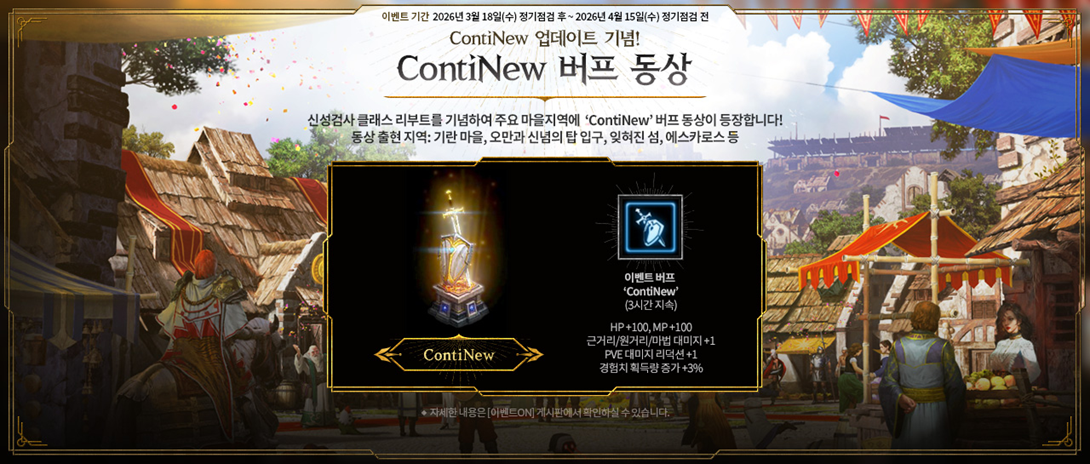 ContiNew 버프 동상 (~4/15)신성검사 클래스 리부트를 기념하여 아덴 월드의 주요 지역에 이벤트 동상이 등장합니다! 동상을 터치하고 더욱 강해진 신성검사의 힘을 느껴보세요! ■ 이벤트 일정 - 2026. 3. 18. (수) 정기점검 후 ~ 2026. 4. 15. (수) 정기점검 전 ■ 이벤트 내용 상세 1) 버프 동상 ‘ContiNew’ - 이벤트 기간, 기란 마을, 오만과 신념의 탑, 에스카로스, 잊혀진 섬, 테베라스 사막, 티칼 사원, 아틀란티스, 라스타바드, 악몽의 섬, 해적섬, 혼돈의 개미굴, 기억의 섬, 지배의 탑 입구, 에오딘 성채, 마족들의 땅에 ‘ContiNew’ 동상이 등장합니다. - 동상을 선택해 ‘ContiNew’ 버프를 획득할 수 있습니다. - 버프는 동상 선택 직후 발동해 3시간 동안 지속되며, 효과는 아래와 같습니다. [이벤트 동상 ‘ContiNew’]