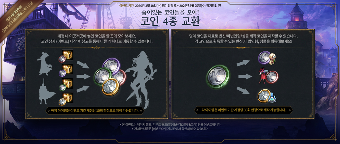 코인 4종 교환 (~3/25)계정 곳곳에 흩어져 있는 코인을 모아 보세요! 캐릭터마다 쌓인 명예 코인, 마법인형 제작 코인, 변신 제작 코인, 성물 제작 코인을 상자로 제작해 창고로 옮길 수 있습니다. ■ 이벤트 일정 - 2026. 3. 18. (수) 정기점검 후 ~ 2026. 3. 25. (수) 정기점검 전 * 신서버 켄트&오렌은 이벤트에서 제외됩니다. ■ 이벤트 내용 상세 1) 코인 10만 상자 (이벤트) 제작 - 이벤트 기간 동안 [제작] 탭을 통해 각종 코인 상자를 제작할 수 있습니다. - 각 코인 상자는 창고 이동이 가능하며, 상자를 개봉하여 각각에 해당하는 코인 100,000개를 획득할 수 있습니다. [코인 10만 상자 (이벤트) 제작]