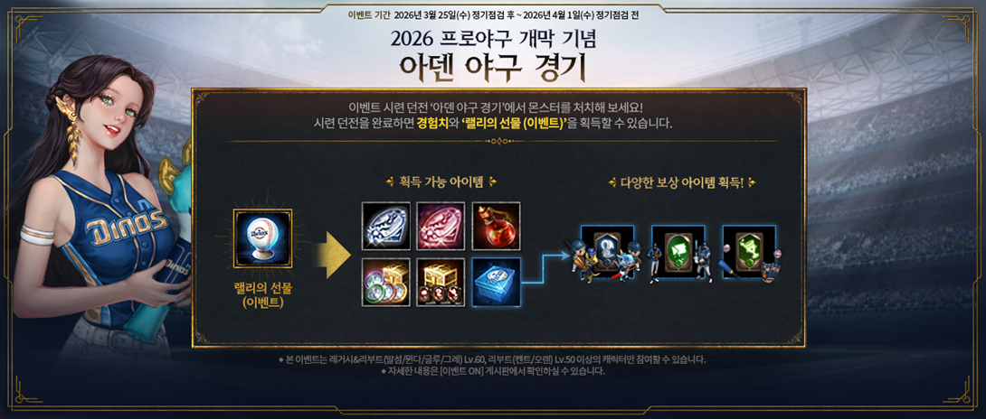 - 2026년 4월 1일 정기점검 이후, 더 이상 이벤트 시련 던전 ‘아덴 야구 경기’에 입장할 수 없습니다.