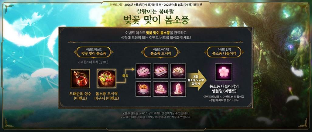 일일 이벤트 퀘스트 - 벚꽃 맞이 봄소풍 (~4/15)벚꽃이 흩날리는 따스한 봄날, 아덴 월드에서도 봄맞이 특별 이벤트가 열립니다! 벚꽃 맞이 봄소풍 이벤트에 참여하여 다양한 버프 아이템과 이벤트 호칭을 획득해 보세요! ■ 이벤트 일정 - 2026. 4. 8. (수) 정기점검 후 ~ 2026. 4. 15. (수) 정기점검 전 ■ 이벤트 요약 1) 매일 이벤트 퀘스트를 통해 이벤트 아이템 ‘드래곤의 성수 (이벤트)’, ‘봄소풍 도시락 바구니 (이벤트)’를 획득할 수 있습니다. 2) 이벤트 제작을 통해 도시락 아이템과 아데나를 소모하여 ‘봄소풍 도시락 바구니 (이벤트)’, ‘봄소풍 도시락 선택 바구니 (이벤트)’를 제작할 수 있습니다. 3) 모든 봄소풍 도시락을 섭취 시, 이벤트 업적 퀘스트 보상으로 ‘봄소풍 나들이객’ 이벤트 버프를 활성화할 수 있습니다. ■ 이벤트 내용 상세 1) 이벤트 퀘스트 - 이벤트 기간 중, 60레벨 이상 용사님들에게는 일일 퀘스트 ‘벚꽃 맞이 봄소풍’이 주어집니다. - 퀘스트 완료 보상 ‘봄소풍 도시락 바구니 (이벤트)’ 사용시, 정해진 확률에 따라 다양한 버프 아이템을 획득할 수 있습니다. [이벤트 일일 퀘스트]