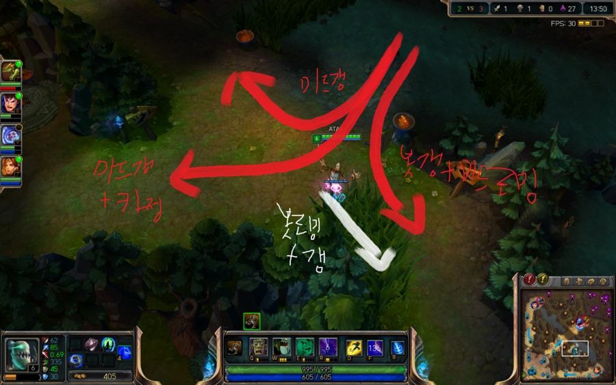 ----------------- 안녕하세요. 롤을 재밌게 즐기고 있는 평범한 유저입니다. 저는 프리시즌, 시즌4가되어 바뀐 아이템중 가장 op아이템은 핑크와드라고 생각합니다. 핑크와드가 너무 좋아져서 한명당 한개밖에 못 박는다는게 정말 아쉬울 정도입니다. 핑크와드는 영구지속 이기 때문에 겜 시작하자마자 바로 박으셔도 상관이 없습니다. 이 팁은 라인전단계에서의 핑크와드 팁입니다. 라인전이 끝난 뒤는 상황에 따라 적절한 곳에 핑크와드를 박으시면 됩니다.