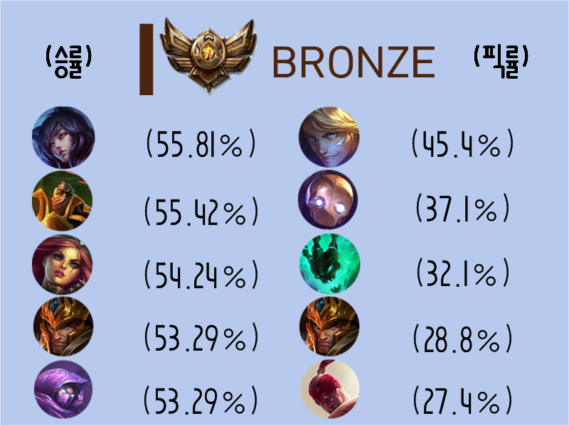 제가 티어별 승률과 픽률이 가장 높은 다섯 챔피언을 인포그래픽으로 간단히 만들어보았습니다. 보시고 부족하거나 고쳐야할 부분이 있으시면 지적 부탁드립니다. ![]() 브론즈 구간 승률 1위 챔피언은 죽음 불꽃 손아귀 (데파) 의 삭제로 인해 패치된 아리가 차지하였습니다. 사실 자료를 보시다보면 아시겠지만 아리가 전 구간 승률 1위입니다. 스웨인과 말자하는 픽률은 저조하지만 쓰는 사람만 쓰는 챔프라 그런지 숙련도가 높아서일까요? 5위안에 랭크되었네요! 그리고 픽률 1위는 가장 무난한 원딜러라 불리는 이즈리얼이 차지하였네요. ![]() 다음은 실버구간입니다. 승률 1위는 역시 마찬가지로 갓아리!! 픽률도 이즈리얼이 다시 한번 1위를 차지했습니다. ![]() 이번에는 골드 구간입니다. 승률 1위는 아리네요. 승률 1위로 볼 수 있듯 아리는 제 생각에 지금 현재 OP 같습니다. 골드구간 승률 순위에서 조금 바뀐 점이 있다면 샤코와 자이라가 3위 4위로 자리매김 하였네요. 제가 생각하기엔 자이라가 꿀빨아서 올라가기 좋은 챔피언 같습니다. 픽률 1위는 또 지긋지긋한 이즈리얼이네요. 거의 두판에 한번 꼴로 나오는 것 같습니다. ![]() 네 다음은 제 (돌아가고싶은) 고향 플래티넘입니다. 승률 1위는 역시나 아리구요. 카서스,니달리가 각각 2위,3위에 반열에 올라섰네요. 니달리는 현재 정글로도 괜찮은 포지션이라는 말이 여기저기서 들리고 있습니다. 저도 해봤더니 좋더라고요. 카정 특화 정글러랄까... 픽률은 이즈리얼이 1위를 차지했습니다. 자 플래티넘 구간에서 달라진 점은 잔나가 5위에 등장했다는 것입니다. 브론즈 실버 골드에서는 잔나보단 역시 끄는 재미가 있는 블리츠죠. ![]() 다이아 구간입니다. 제가 우러러 보는 티어죠. 승률 부문에서 헤카림이 보이네요. 다이아에서 헤카림 잘하시는 분이 여럿 있죠. 그 분들 덕에 4위에 오를 수 있지 않았나.. 조심스럽게 생각해봅니다. 그리고 잔나의 픽률이 더욱 더 상승합니다. 티어가 올라갈수록 잔나의 픽률이 상승하네요. 잔나는 그만큼 난이도가 있고 잘 써야 좋은 챔프라는 생각이 드네요. 글을 마무리하면서 제가 브론즈 실버 골드 구간에서 꿀빨수 있는 챔프를 추천해드릴게요. 니달리 정글이 정말 좋습니다!! 패시브를 정글 몬스터에게도 적용하니 정글링도 빠르네요. 특히 카정이 정말 잘되는 정글러 같습니다. 브실골분들 니달리 정글로 꿀빠세요!