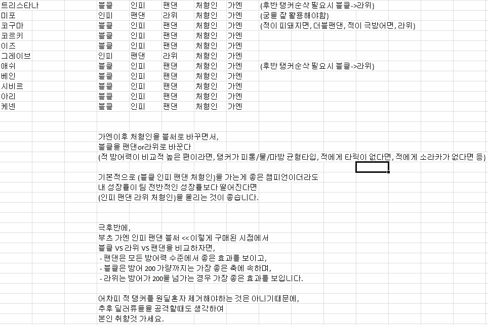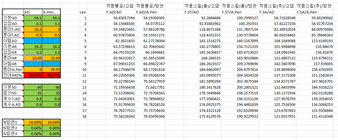 [물리스킬 & 평타 데미지 시뮬레이터] & [원딜 DPS 시뮬레이터][물리스킬 & 평타 데미지 시뮬레이터] 기본 설정은 그레이브 VS 그레이브 입니다. 엑셀파일 있으니 참고해서 원하는거 시뮬레이션 해보세요. 색 들어가 있는 칸에 있는 수치를, 원하시는 챔프 수치로 바꾸시면 결과를 확인하실 수 있습니다. 방어적인 부분을 적 챔피언의 정보를 입력하시고, 공격적인 부분을 아군 챔피언의 정보를 입력하시면, 해당 대상에 대한 정보가 나옵니다. 평타데미지와 물리계수 물리데미지 스킬정보를 출력합니다. 단, 스킬은 1개씩만 볼 수 있습니다. 한번에 여러 스킬보기에는 귀차니즈으으응음............ 기본적으로 평타데미지 / 총계수스킬데미지 / 추가계수스킬데미지 3가지를 보여드립니다. ![]() ![]() [원딜 DPS 시뮬레이터] 이미 LOL시뮬레이터가 있지만, 사용해보니 적 방어력을 계산한 실질 DPS가 아닌 챔피언 자체의 명목 DPS이기때문에 방어력 및 방관에 대한 가치가 측정이 안 되기에 새롭게 만들어 봤습니다. 야매로 만든거라 이쁘지는 않습니다. 첨부파일에서 초록색 셀이 수정가능하고, 수정해야하는 자료부분입니다. 아래는 시뮬레이터를 활용하여 제가 실험한 내용입니다. ----------------------------------------------------------------------- 자기가 자기 챔프 맞춰서 알아서 판단하세요. 이건 팁입니다. 정보로 활용하시면 됩니다. 질문은 허용/태클은 반사 비교아이템 3종 1. 버서커 인피 팬댄 라위 처형인 2. 버서커 블클 인피 라위 처형인 3. 버서커 블클 인피 팬댄 처형인 ※ 선블써가 아닌 인피기반의 템트리가 올라갈때, 처형인을 쓰는 이유, 부츠 공템3종 흡낫 = 인벤5칸 이 상황에서 블써를 갈 돈이면 가엔을 뽑을수 있습니다. 블써를 감으로 얻는 DPS보다 가엔을 뽑는게 더 도움이 되기에, 가엔>블써의 순서로 뽑을텐데, 이 경우 기본흡낫으로 뻐겨야합니다. 가엔을 가기전에 처형인을 가면 인벤은 그대로 5개, 골드소모900으로 AD25-30(크리15%의 효과)과 흡혈율18%를 얻을수있습니다. 이후 가엔을 가고, 마지막에 도핑을하면서 돈이 모이면 처형인을 팔고 블써를 가는게 (처형인 판매 손해 약400골드, 400골드 투자해서 2550골드 모을 시간동안 흡혈18% AD25-30의 효과를 떙겨쓰는 셈) 가장 적절한 빌드라고 봅니다. 방어력에 따른 템트리별 DPS 방어80기준 (블클은 처음부터 3스택기준) 1. 버서커 인피 팬댄 라위 처형인 : 694 2. 버서커 블클 인피 라위 처형인 : 730 3. 버서커 블클 인피 팬댄 처형인 : 905 ★ 방어120기준 (블클은 처음부터 3스택기준) 1. 버서커 인피 팬댄 라위 처형인 : 601 2. 버서커 블클 인피 라위 처형인 : 615 3. 버서커 블클 인피 팬댄 처형인 : 704 ★ 방어200기준 (블클은 처음부터 3스택기준) 1. 버서커 인피 팬댄 라위 처형인 : 474 2. 버서커 블클 인피 라위 처형인 : 468 3. 버서커 블클 인피 팬댄 처형인 : 488 ★ 방어300기준 (블클은 처음부터 3스택기준) 1. 버서커 인피 팬댄 라위 처형인 : 375 ★ 2. 버서커 블클 인피 라위 처형인 : 360 3. 버서커 블클 인피 팬댄 처형인 : 352 결과에 대한 의견, 중간 템트리별로 올라가는 DPS는 따지지않았지만, 최종 DPS를 보면 라위와 블클을 비슷한 DPS (방어력에 따라 약간씩 차이나는 정도) 최고 DPS는 팬댄. 단, 라위의 경우 물리스킬 데미지 증폭 효과가 있음(방80-20%, 방200-35%). 블클도 있지만, 디버프형식이라 평타로 쳐야지 방감이 적용되기 때문에, 실적용되는 부분은 거의 없다고 봐야함. AP스킬챔피언(평타의존형)의 경우, 3번 템트리가 유용 (트리스타나, 코구마 등) AD 광역스킬 챔피언(스킬의존형)의 경우, 2번 템트리가 유용 (그레이브 등) 평타와 스킬이 모두 중요하다면, 자기가 챔프별로 따져봐서 쓰세요. 미포로 궁을 적절히 활용하면 1번이나 2번이 좋고, 궁을 막타로만 쓰고, 평타로 싸운다면 3번 템트리가 좋고, 시비르의 경우 QW를 모두 광역으로 잘 맞춘다면 1번이나 2번이 좋고, 단일타겟 기준 누킹으로는 3번이 좋고, 1번 템트리는 2번과 비슷하지만 조금 더 평타에 치우쳐있음. 2번을 쓰는 챔프의 경우, 취향에 따라 1번 템트리를 써도 무방. 기본적으로 2도란+블클의 위력은, 풀스택 블써랑 동일 수준임. 또한 블써와 달리 블클은 후속템과 시너지효과가 있기때문에, 블써보다 블클이 차라리 유용한 경우가 많음. 실험2 : 원딜풀템 DPS비교 기준챔프는 18렙 트리스타나입니다. 룬은 빨룬고뎀 보라흡혈룬기준입니다. 위쪽 자료는 공속버프 미사용이고, 아래쪽 자료는 공속버프(90%) 사용상태입니다. 블클의 경우, 방감45상태를 적용한 자료입니다. (1타 2타에서 저것보다 딜량이 떨어지지만, 블클 방감은 디버프 형식으로, 팀전체에 적용되므로 그 정도는 커버할수있다고봅니다.) 자료 1 ![]() 자료 2 ![]() 활용예 아래에 적어놨지만, 말렸으면 그냥 평범하게 (인피 팬댄 라위 처형 가엔) 가시는게 좋습니다. ![]() ※ 시비르는 (인피 팬댄 라위 처형 가엔) 가시는 것도 좋습니다. << 이 경우 광역딜에 치중 - 적이 전반적으로 아머가 좀 될때 ※ 시비르로 블클을 갈 경우 기본 콤보는 평W평Q평평W평 이 됩니다. << 이 경우 단일타겟 폭딜 |