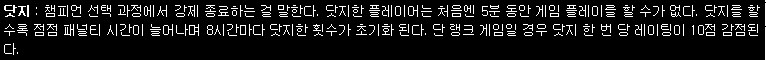 닷지에 관한 모든것 (최종본)(1) 닷지 패널티 시간은 얼마나 주어지는가? 7월 3일 업데이트로 인해 닷지 패널티가 바뀌었습니다. 그에 따라 여러가지 실험을 하였고 다음과 같은 결과를 얻었습니다. 노멀 게임 이전과 같이 첫 닷지는 6분의 패널티가 주어지며, 2번째 이후로는 15분의 패널티가 주어집니다. 랭크 게임 이전과 달리 닷지해도 랭크 점수가 깎이지 않습니다. 이전과 달리 첫 닷지는 30분의 패널티가 주어지며, 2번째 이후로는 1시간의 패널티가 주어집니다. (5번 연속 닷지로 실험하였습니다) 통합 패널티가 없는 상태에서, 랭크 닷지 후 노멀을 닷지하면 30분 → 15분 순으로 패널티가 주어집니다. 패널티가 없는 상태에서, 노멀 닷지 후 랭크를 닷지하면 6분 → 1시간 순으로 패널티가 주어집니다. (이런 부조리한...!) 노멀, 랭크 어느쪽의 패널티 시간이든 노멀, 랭크 둘 다 불가능하며, 사용자 설정 게임은 가능합니다. (그래서 이번 업데이트에 증명의 전장을 같이 한건가...!) (2) 닷지 패널티는 언제 초기화 되는가? 이것에 대한 확정적인 정보를 찾기 힘들더군요. 그나마 인터넷에서 찾은 정보라고는 ![]() 이게 다입니다. 유감스럽게도 이 정보를 뒷받침할 다른 근거나 확정적인 정보는 도저히 찾을 수 없더군요. (심지어 이 정보가 사실이었다고 할지라도 거듭된 패치로 인해 바뀌었을 가능성도 있고) 그래서 GM 에게 문의를 넣어봤습니다. 모르는건 GM 에게 물어봐야죠. ![]() 그러나 GM 도 가르쳐주지 않습니다... 별수없이 개인적으로 실험을 했습니다. 그나마 8시간이라는 단서가 있으니 그걸 토대로 실험한 결과, 8시간이 맞긴 맞는데 조건이 좀 붙더군요. 마지막으로 받은 닷지 패널티 시간이 종료된 후에 8시간이 경과해야 됩니다. 예를 들어서 닷지로 1시간 패널티를 받았다면 1시간 + 8시간해서 9시간이 지나야 초기화됩니다. 실험 내용은 다음과 같습니다. 1) 6분 노멀 패널티를 받은 후 - 8시간 2분 후에 노멀 닷지, 누적으로 15분 패널티 - 8시간 7분 후에 노멀 닷지, 초기화되어 6분 패널티 2) 15분 노멀 패널티를 받은 후 - 8시간 12분 후에 노멀 닷지, 누적으로 15분 패널티 - 8시간 17분 후에 노멀 닷지, 초기화되어 6분 패널티 3) 30분 랭크 패널티를 받은 후 - 8시간 27분 후에 랭크 닷지, 누적으로 1시간 패널티 - 8시간 32분 후에 랭크 닷지, 초기화되어 30분 패널티 4) 1시간 랭크 패널티를 받은 후 - 8시간 57분 후에 랭크 닷지, 누적으로 1시간 패널티 - 9시간 2분 후에 랭크 닷지, 초기화되어 30분 패널티 이외에 노멀 패널티 후 랭크 닷지, 랭크 패널티 후 노멀 닷지까지 다 실험한 결과 닷지 패널티 시간 + 8시간 이라는 초기화 공식은 거의 확정적인 것으로 결론 나왔습니다. |